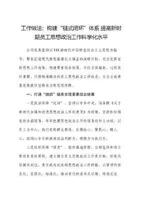 工作做法:构建链式闭环体系 提高新时期员工思想政治工作科学化水平公司党委坚持以XXX新时代中国特色社会主义思想为指导,聚焦打造现代新型能源化工强企的战略目标,充分发挥宣传思想工作优势,构建要素综合统筹、方位立体辐射、过程实时掌握、问题精准解决的员工思想政治工作体系,为企业高质量发展提供坚强有力的思想保障。一、打通组织链条实现要素综合统筹一是政治保障定向。坚持以中共中央、国务院《关于新时代加强和改进思想政治工作的意见》为统领,坚持和加强党的全面领导,牢牢把握思想政治工作的领导权和主动权,以员工为中心,践行党的群众路线,在强信心、聚民心、暖人心、筑同心中不断提高政治判断力、领悟力与执行力。二是组织保障强责。按照属地管理、分级包保和谁主管谁负责的原则,建立健全员工思想政治工作责任制,织密内容横向到位、责任纵向到底的思想政治工作网格,以管理的体系化、层级化、标准化,推动责任的清单式认领、精准式追踪、闭合式落实。按照政治素质强、政策理论通、工作作风硬、沟通能力好、群众威信高的标准,积极选优配强宣传思想工作者队伍,不断增强企业思想政治工作的亲和力、吸引力与凝聚力。三是制度保障注力。围绕做好员工思想政治工作,建立政治理论学习、形势任务教育、道德讲堂培塑、交流分享、零距离沟通、员工思想动态分析、思想政治工作调度和总结讲评等工作制度,为员工思想政治工作提供基础保障。四是阵地保障增能。围绕增强政治性、提高认同率、唱响主旋律和传播正能量,全面加强线上线下阵地建设,利用开办学习专栏、组织专题道德讲堂、微信公众号发布等多种形式,把党的基本理论、基本路线、基本方略制作成贴近群众、贴近生活的内容,真正让党的创新理论飞入寻常百姓家。二、打通作用链条实现方位立体辐射一是集中教育覆盖大多数。充分发挥股份公司、三级单位、基层区科三级宣讲平台作用,开展接地气、有温度的主题教育和专题宣讲,把形势宣传到一线,把措施推送到一文可居文库——海量学习资料,手机电脑均可下载www.wenkeju.com线,把干劲鼓舞到一线。结合不同时期重点工作,积极开展解放思想大讨论、企业发展大家谈我为企业科学发展献良策等系列活动,使广大员工知形势、明任务、尽责任,激发了主动参与公司管理、服务科学发展的意识。二是精准施策稳定特殊群。加强特殊群体和重点人群指导。区分十二种人,即政治敏感性不强的迟钝人、政策规定不清的门外人、心理情绪不稳的过激人、生活工作困扰的分心人、批评处分失衡的逆反人、我行我素脱群的执拗人、爱发表言论的吐槽人、经常抱怨不满的负能人、岗位发生变动的切换人、身体患病的高危人、存在思想行为隐患的安全无把握人、诉求不满讨说法的上访人,坚持分类指导,一人一策。三是承上启下抓住关键层。紧紧抓住公司党政班子、机关部室人员、基层区科管理技术干部、班组长、宣讲员队伍等关键层,为其提前开好充电学习小灶,使之对形势、政策、制度、措施以及开展思想政治工作的艺术方法等深学一层、先行一步,成为政治坚定、政策明白、工作示范的思文可居文库——海量学习资料,手机电脑均可下载www.wenkeju.com想政治行家里手,发挥头雁作用和辐射效应,进区科、驻班组、入家庭、访员工,以接地气的方式开展传帮带,做好亲情式思想引导工作。四是多点共振拓宽宣传源。围绕员工走过的路线得到提示、驻留的地方看到图文、工作的地点听到声音,积极拓宽思想传播和文化影响的渠道,打造无处不在的宣传源。所属x公司结合煤化工面临形势,建立共话中润短视频宣传平台,设置身边有榜样安全在日常点赞新场景发现中润美四个宣传版块,由一线员工出镜讲述中润好故事,展现了煤化工建设场景和员工风貌。三、打通信息链条实现过程实时掌握一是线上+线下畅通渠道。采取个人访谈、集体座谈、重点单位走访、重点人群恳谈、员工接待日、线上征集、网络关注等多种方式,畅通员工表达诉求的渠道,及时掌握员工思想动态。二是走进+拉近拓展方式。采取进区科、进班组、进现场、进宿舍、进家庭五进的方式积极走进员工,利用唠嗑文可居文库——海量学习资料,手机电脑均可下载www.wenkeju.com式、咨询式、恳谈式、会商式、结对式亲情+互动的方式,竭诚拉近距离,将员工所思、所想、所盼、所惑、所扰悉数掌握。三是分析+分类掌控源头。健全员工思想动态分析、网络舆情研判与员工思想工作例会协同推进工作模式,汇总分析员工思想动态和舆情状况,精准分类,及时发现苗头性、倾向性和普遍性问题,准确预测影响范围以及可能造成的后果,形成员工思想和网络舆情分析材料,为有针对性地开展思想政治工作提供依据和遵循。四、打通方法链条实