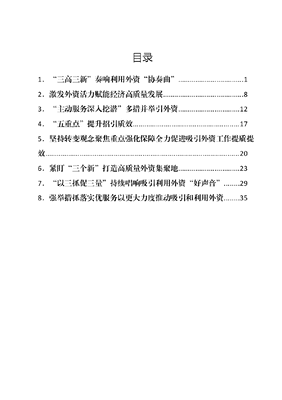 目录1.三高三新奏响利用外资协奏曲.12.激发外资活力赋能经济高质量发展83.主动服务深入挖潜多措并举引外资..124.五重点提升招引质效.175.坚持转变观念聚焦重点强化保障全力促进吸引外资工作提质提效..206.紧盯三个新打造高质量外资集聚地..237.以三抓促三量持续唱响吸引利用外资好声音..298.强举措抓落实优服务以更大力度推动吸引和利用外资..35三高三新奏响利用外资协奏曲积极吸引和利用外资是改革开放以来我国实现快速发展的一条重要经验。今年的中央经济工作会议提出要扩大高水平对外开放,这充分彰显了我国对外开放的基本国策和坚定决心。近年来,德安县把吸引利用外资作为激活地方经济发展的重要途径之一,充分发挥比较优势,不断改善投资环境,着力扩增量、稳存量、提质量,推动全县利用外资保稳促优。今年1-11月,德安现汇进资583万美元。目前,全县共有外商投资企业20家,分别来自波兰、菲律宾、中国台湾等地。其中,今年新注册企业2家,增资扩股企业2家。一、推动高水平对外开放,让德安成为外企投资新热土。赓续千年文脉,塑造城市精神。德安,在其千年的发展进程中,历经几次大迁移,成为一座移民城市,血脉中浸透着包容的基因。从唐朝开始,就不断有外地人来德安落籍谋生。新中国成立后,1955年至1956年间,从上海迁入近五千人;1969年,从浙江淳安县迁入四千多人。在中华优秀传统文化和义门陈家风文化的熏陶下,德安形成了厚德图强、包容开放的城市精神德安人民也以其深厚的情义内涵,吸引了五湖四海、四面八方的朋友相聚德安,扎根德安。越来越多的客商、高管、技术工文可居文库——海量学习资料,手机电脑均可下载www.wenkeju.com人都慢慢地变成了新德安人。九省乐居一村,十里不闻乡音。独特的人文,造就了德安厚泽润物的感召力,也成了外资企业欣然前往投资的新热土。建设平安德安,稳固发展根基。稳定的社会大局、长期向好的经济基本面等综合优势将有效保障外资对安全、回报和市场的期盼。近年来,德安县积极创新探索市域社会治理现代化试点工作新模式,发挥德治教化功能,汇聚各方治理力量,让社会治理建立在更高水准的道德水平上,彰显德润人心社会治理的地域特色,乡贤引领、以德为先、网格化管理工作模式在德安县取得明显成效。德安县连续11年荣获全市平安建设(综治工作)优秀县称号,2022年平安建设荣获全市第二。与此同时,德安不断强化外资保障服务,全面落实《外商投资法》,认真执行外资准入负面清单,落实好外资企业国民待遇,加大知识产权保护力度,有针对性做好外资企业服务工作,梳理确定一批重点服务外资企业名单,形成常态化点对点对接服务机制,及时协调解决企业问题和困难,分类施策做好服务工作,努力把更多高质量外资吸引过来。另外,在每年年初制定颁发的开放型经济工作意见中,专门设立外资现汇奖,加大对招引外资企业入驻的鼓励。德安,正在全力打造人人向往的心安之地,让企业家真正感受到有一种平安,叫我在德安。文可居文库——海量学习资料,手机电脑均可下载www.wenkeju.com积极融圈入群,打造开放支点。德安县区位优势明显,交通十分便利,已经形成了对外四通八达、对内纵横交错的交通网络德安县第十九次党代会因时而进、因事而化、因势而新,提出要把德安打造成为大南昌都市圈重要战略节点、昌九沿线双向开放支点。近年来,德安县不断放大坐标系,找准参照物,充分发挥位置优势,积极对接一带一路、长江经济带粤港澳大湾区城市群,主动参与江西内陆开放型经济试验区、大南昌都市圈建设。完成文华大道和文华大桥建设,实现与昌九快车线的无缝对接,畅通德安东大门;昌九高速德安南互通即将建成通车,畅通德安南大门;加快推动大南昌都市圈市域(郊)铁路昌北机场至德安段、德武高速公路规划建设,完善对外快速通道网络。德安,正在持续扩大对外开放中实现经济大跨越。二、筑牢高标准产业基础,让德安成为项目落地新选择。主导产业链式发展,各显神通。近年来,德安县坚持吸