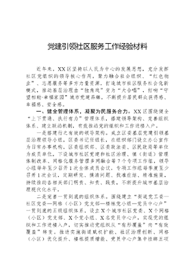 党建引领社区服务工作经验材料近年来,XX区坚持以人民为中心的发展思想,充分发挥社区党组织的领导核心作用,聚力融合社会组织、红色物业、志愿服务等多方力量资源,打造城市社区服务社会化新模式,推动基层治理由独角戏变为大合唱,打响守望相助·幸福家园城市党建品牌,不断提升居民群众获得感、幸福感、安全感。一、健全管理体系,凝聚为民服务合力。XX区围绕健全上下贯通、执行有力管理体系,搭建领导架构、完善组织体系、建立联动机制,有效推动党的组织和工作进楼入户。一是搭建行之有效的领导架构。成立区委基层党建引领基层治理领导小组,区委书记任组长,在组织部门设立办公室作为日常办事机构,区委组织部、区委政法委、区民政局等单位为成员单位,下设城市社区党建和社区治理、镇(街道)管理体制改革、网格化服务管理多网融合等7个专项工作组,领导小组每年至少召开1次全体成员会议,专项工作组每季度至少召开1次会议,定期研究、摸清问题、找准症结、精准施策,持续推动各相关部门明责、知责、践责,不断提升城市基层治理现代化水平。二是完善一贯到底的组织体系。围绕建立街道党工委—社区党委—网格(小区)党支部—楼栋党小组—党员中心户一贯到底的五级组织体系,设立X个城市社区党委、X个网格(小区)党支部、X个党小组、X名党员中心户,实现党的组织和工作进楼入户,切实推动党组织从有形覆盖向有效覆盖转变。推进实施街道赋权扩能、社区治理创新、网格(小区)优化提升、楼栋提质增能、党员中心户集中挂牌五项行动,将城市基层治理各个层级的工作重心转移到抓党建、抓治理、抓服务上来。三是建立多方协作的联动机制。聚焦建好用好社区大党委,积极推行红色合伙人模式,通过制定兼职委员联席会议双向服务活动联办资源共享等工作机制,将居民委员会、业主委员会、物业服务企业、共驻共建单位、社会组织等多方力量统筹起来,探索建立党建会客厅、百姓议事台等协商议事载体,畅通辖区内各类主体参与协商渠道,推动街道社区党建、单位党建、行业党建互联互动。建立网格长、楼栋长、单元长三长联动机制,X个机关企事业单位的X名干部下沉一线,形成领导有力、平急结合的强大合力。二、用活社会组织,激发为民服务活力。XX区坚持把党建引领融入社会组织孵化、培育、壮大全过程,积极引导社会组织融入基层治理,不断提升社会组织活力。一是引进专业化社会组织。面对社区居民更加多元的诉求,XX区以社区党委为支点,不断吸纳社会组织成员在社区党委中担任兼职委员,签订共建协议,共同参与社区治理。健全社区居民问题需求与社会组织服务供给对接机制,定期向居民群众、社会组织收集需求清单资源清单,由社会组织进行接单办理,实现资源共享、共驻共建。二是打造规范化服务阵地。秉持空间换资源、空间换服务理念,按照社会组织需求改造、建设集书画室、幸福食堂、舞蹈瑜伽室、传统文化室、少儿课堂于一体的社区活动场所,供社会组织免费入驻。社会组织按照社区要求无偿向居民提供相应服务,在服务的同时进行客户转换,找到效益和公益的最大公约数,既能提供利民服务,又能实现自身发展。三是开展多样化服务活动。聚焦社会组织发展与社区治理深度融合,构建社区发现需求、社工开发设计项目、社区社会组织实施、社区公益基金支持、社区志愿者参与的五社文可居文库——海量学习资料,手机电脑均可下载www.wenkeju.com联动服务机制,充分发挥社会组织的专业化优势,不断提高居民获得感、幸福感、满意度。目前累计孵化社区社会组织X个,链接社会组织支持资源X家,组织各类社区活动X余场次,带动X万余人次参与社区社会组织活动,服务居民群众超过X万余人次。三、做实红色物业,增添为民服务动力。XX区围绕深化红色物业建设,打响红色物业 情暖万家品牌,聚力建强组织、服务、考评体系,全力解决居民群众身边小事、关键小事。一是建强红色物业组织体系。深化社区物业党建联建,实施党组织集中覆盖行动,设立物业服务企业党支部X个,实现物业服务企业党的组织、工作全覆盖。强化社区党组织对物业服务企业的统筹指导,社区党组织与物业企业党组织党课联上、活动联办、工作联抓。成立物业行业党委,每季度组织召开红色物业深化提升联席会议,研究解决群众的急难愁盼问题。二是建强红色物业服务体系。推行社区和辖区内集体经济组织领办红色惠民物业企业机制,X个老旧小区实现专业化物业服务全覆盖。各物管小区每月开展一次红色物业服务日项目经理接待日活动,将物业服务送到居民家门口,2023年以来,已办结群众身边的物业诉求X余项。建立镇街、社区两级物业纠纷诉调中心,健全物业服务管理社区协商共治机制,形成大事共议、实事共办、要事共决、急事共商、难事共解五事联办常态机制。三是建强红色