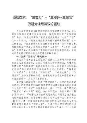 经验交流:三着力+三提升+三激活促进党建经营双轮驱动为全面贯彻党的XXX精神和新时代党的建设总要求,深入落实全国国企党建工作会议精神,按照集团公司提质增效年要求,XX党支部聚焦基层党建提质增效七抓工程这一工作中心,构建党建经营双轮驱动联动发展机制这一工作重点,高质量党建引领保障高质量发展这一终极目标,积极创新工作思路,发挥基层党建三着力+三提升+三激活引领优势,有力增强了党组织政治功能和组织功能,全面提升了党建创新驱动能力和促进经营融合能力。一、发挥三着力带动优势党支部作为国企基层党组织,坚持以XXX新时代中国特色社会主义思想为指导,结合公司重点工作开展情况,及时成立党建经营双轮驱动联动发展领导小组。由支部书记任组长,支委班子和公司领导班子其他成员为该小组成员,严格履行一岗双责。通过突出政治引领、载体支撑、作用发挥三个方面积极作用,推进党建向公司生产经营改革各方面拓展延伸,并取得了显著成效。着力强化政治引领,打造精神家园。以党的政治建设为统领,把贯彻落实XXXXXX最新重要讲话精神和指示批示精神作为践行两个维护的重要抓手。通过三会一课等形式,严格落实第一议题制度,2023年到现在,共列入第一议题学习90多个,严格落实支委会研究讨论是公司经理层决策重大问题的前置程序,支委会研究讨论公司三重一大事项共计14