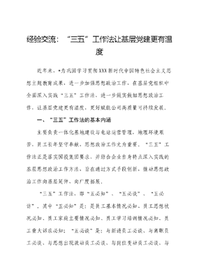经验交流:三五工作法让基层党建更有温度近年来,*为巩固学习贯彻XXX新时代中国特色社会主义思想主题教育成果,进一步加强思想政治工作,在基层党组织中全面深入实践三五工作法,进一步做实做细思想政治工作,让基层党建更有温度,更好赋能公司高质量可持续发展。一、三五工作法的基本内涵主要负责一体化基地建设与电站运营管理,地理环境艰苦,员工长年坚守奉献,思想政治工作尤为重要。三五工作法正是落实国投集团要求,并结合企业自身特点深入实践的基层思想政治工作方法,旨在通过方式手段创新,推动思想政治工作向基层延伸、向广度拓展。三五工作法,即五必知、五必谈、五必访。其中五必知是:是员工基本情况必知、员工思想状况必知、员工家庭主要情况必知、员工学习培训情况必知、员工重大诉求必知;五必谈是:与新进员工必谈、与离职员工必谈、与思想出现波动员工必谈、与岗位变动员工必谈、与犯错误员工必谈;五必访是:员工因重大疾病住院时必访、员工婚丧嫁娶必访、女员工生育后必访、员工家庭生活困难时必访、员工家庭发生重大矛盾时必访。二、三五工作法实施方法从管理制度上,党委制定印发落实党内关怀帮扶办法实施细则,将三五工作法作为党内关怀的主要方法。从工作机制上,将三五工作法列入加强和改进思想政治工作的系列举措,写入基层党支部工作指引,纳入基层党组织年度重点任务和季度工作清单,每半年开展一