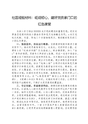 社区经验材料:砥砺初心,建好党员家门口的红色课堂为深入学习领会XXXXXX关于党的建设的重要思想,更好发挥基层党组织的战斗堡垒作用和党员先锋模范作用,x社区党校从机制、内容、阵地三个方面持续用力,做好做实党员家门口的红色课堂。一、强基固本,夯实运行根基。坚持教学制度和教学力量双管齐下,推动党员教育常态化、长效化。充实师资力量。在原有5名红色讲师团队伍基础上,联合镇团委,加入金x青年讲师团,用青年之声讲好x故事,形成一支老中青结合、侧重点各不相同的社区党校师资队伍,为开展好社区党校各项教育培训工作提供支撑。建立评价机制。建立课程内容和授课老师综合评价机制,结合先锋上海小程序在线收集党员满意度评价和意见反馈,提高党员教育培训针对性、精准性、实效性。扩大覆盖面。针对不同参与对象的差异化需求,量身定制培训方案;如居村老党员比例高、路程较远,采用送学上门、远程教育等方式;在x基层党建微信公众号推出《学习语》、《党建小知识》等专栏,定期发布学习内容,让党员利用网络平台随时学,不断扩大党员教育的覆盖面。二、守正创新,丰富教学内容。持续创新党性教育的载体和形式,以直抵人心的方式教育引导党员始终牢记共产党员第一身份,始终与党同心同德,让初心薪火相传,把使命勇担在肩。主题党课强基铸魂。持续开展主题党课,通过领读《中国共产党纪律处分条例》、开展党纪学习知识竞赛、重温入党誓词、朗读红色家书