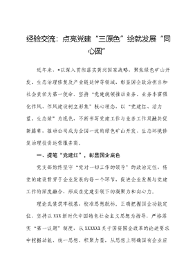 经验交流:点亮党建三原色绘就发展同心圆近年来,*以深入贯彻落实黄河国家战略,聚焦绿色矿山开发、生态治理修复及产业链延伸等领域,彰显国企政治担当和社会责任为第一使命,坚持党建统领推动业务、业务丰富强化作风、作风建设树立形象核心理念,以党建红、活力蓝、生态绿为底色,不断书写党建工作与业务工作双融共促新篇章,推动公司成为全国一流的绿色矿山开发、生态环境修复治理投资运营服务商。一、提笔党建红,彰显国企底色党支部始终坚守党对一切工作的领导的政治定位,将党的建设贯穿于企业发展的每一个环节,促进企业发展与党建工作的深度融合,形成在党建引领下的凝聚力和向心力。理论武装筑牢根基,校准思想航标。正确把握国企功能定位,坚持以XXX新时代中国特色社会主义思想为指导,严格落实第一议题制度,从XXXXXX关于国资国企改革的论述要求中挖掘动能、统一思想、积聚力量,从思想上明确国有企业应该为了谁、干什么、怎么办,切实将党的创新理论转化为推动公司高质量发展的强大动力。创新理论武装方式载体,依托党纪学习教育、灯塔书屋、我们的节日、安全生产培训等活动,综合运用专题学习、现场观摩、案例分析、座谈交流等多种方式,创新开展三会一课、主题党日等组织生活,引导党员将所学所思转化为所行所用。政治统领强化管理,夯实治理基础。从融字上下功夫,推进党建+业务双融共促。一方面,以政治引领公司治理