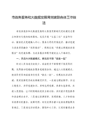 市政务服务和大数据发展局党建联合体工作做法市政务服务和大数据发展局认真落实新时代党的建设总要求和新时代党的组织路线,扎实开展五基三化攻坚年行动,探索机关党建融入中心、服务大局的有效途径,推动党建与政务深度融合双轮驱动,积极打造党建云联建政务新服务的党建品牌,为政务服务和数字建设注入不竭动力。一、开启六大联建模式,把党员干部拢在一起针对人员沟通交流较少、派驻党员干部管理不规范等问题,我局推动创建政务服务党建联合体,通过六大联建模式,把我局党员和派驻单位党员拢在一起,实现组织活动共建,更好发挥党员的先锋模范作用。一是通过理论联学,共过主题党日、共学党建知识、共听优秀党课、共看红色影视、共谈入党感悟,让不同领域的党员互相对标,共同提升党性修养和政治理论水平。二是通过资源联享,实现阵地、人才和经验等资源有机整合、统筹利用,切实发挥各窗口优势资源集聚共享效应。三是通过活动联办,围绕中心工作,以更好推进业务工作为目的,联合开展文明实践活动,把党员干部的智慧和力量凝聚到服务发展上来。四是通过队伍联建,互学经验、互传理念、互拓思路、互鉴教训、互提能力,着力加强党员队伍建设。五是通过工作联动,调动各窗口力量,统筹推进放管服改革、简易办改革、优化营商环境等工作。六是通过纪律联抓,推进干部作风纪律建设和机关清廉清正建设,进一步树立党员干部良好形象。二、打造六大政务先锋,使业务