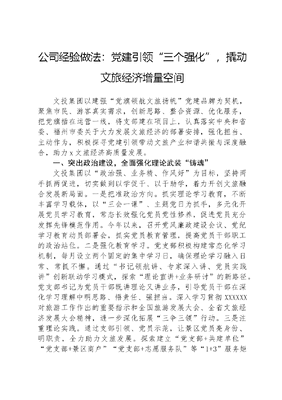公司经验做法:党建引领三个强化,撬动文旅经济增量空间文投集团以建强党旗领航文旅扬帆党建品牌为契机,聚焦市民、游客真实需求,创新思路、整合资源、优化服务,把党旗插在运营一线,将支部建在项目上,认真落实中央和省委、福州市委关于大力发展文旅经济的部署安排,强化担当、主动作为,积极探寻党建引领带动文旅产业和谐共振与深度融合,助力x文旅经济高质量发展。一、突出政治建设,全面强化理论武装铸魂文投集团以政治强、业务精、作风好为目标,坚持两手抓两促进,切实做到以学促干、以干助学,着力开创文旅融合发展新局面。一是把准政治方向。抓实理论学习教育,不断丰富学习载体,以三会一课、主题党日为抓手,多元化开展党员学习教育,常态长效强化党员党性修养,促进党员充分发挥先锋模范作用。今年以来,召开党风廉政建设会议、党纪学习教育动员部署会,抓实党员教育管理,提高党员干部职工的政治站位。二是强化教育学习。党支部积极构建常态化学习机制,每月设立两个固定的集中学习日,确保理论学习融入日常、常抓不懈。通过书记领航讲、专家深入讲、党员实践讲创新联动学习模式,探索理论宣讲+业务研讨的新路径。党支部书记为党员干部既讲理论又讲业务,引导党员干部在深化学习理解中明思路、悟责任、强担当。深入学习贯彻XXXXXX对旅游工作作出的重要指示和全国旅游发展大会、全省文旅经济发展大会精神,进一步深化拓展三争三领行动