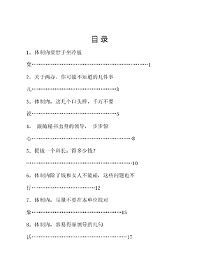 目 录1.体制内要甘于坐冷板凳…………………………………………………………1 2.关于两办,你可能不知道的几件事儿…………………………………………3 3.体制内,这几个口头禅,千万不要说…………………………………………5 4. 跟随秘书出身的领导, 步步惊心…………………………………………………8 5.提拔一个科长,得多少钱?……………………………………………………10 6.体制内除了钱和女人不能碰,这些问题也不行………………………………12 7.体制内,尽量不要在本单位找对象……………………………………………15 8.体制内,容易得罪领导的几句话………………………………………………17 9. : 两办, 是光鲜亮丽还是盛名难副…………………………………………20 10. 单纯的人, 该怎么在体制内混得好……………………………………………22 11.干部调动,就是一条主线、三个问题…………………………………………24 12.体制内的明规则:上进心冲锋、平常心保底、感恩心守局…………………26 13. 国央企工作要务: 保护好自己…………………………………………………28体制内要甘于坐冷板凳一、冷板凳,它冷不冷刚入职场,初入体制,我们会发现,那些梦寐以求的核心岗位似乎遥不可及,你想要的资源高不可攀,你所向往的未来一眼看到了尽头。日复一日的基础工作——整理文件、统计数据、上报材