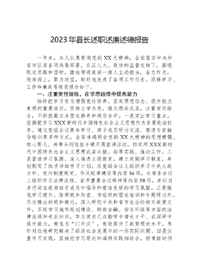 2023年县长述职述廉述德报告一年来,本人认真贯彻党的XX大精神,全面落实中央和省市区委各项决策部署,在区人大、政协的监督支持下,围绕既定思路和目标,团结带领政府一班人主动担当,奋力作为,迎难而上,聚力攻坚,较好地完成了各项工作任务。现将学习、工作和廉政等情况报告如下。一、注重党性锤炼,在学思践悟中提高能力始终把学习作为增强党性修养、坚定理想信念、提升能力素质的重要途径,坚持立学为先,强化理论武装,注重学用结合,不断提高自身理论修养和领导水平。一是突出学习重点。坚持把学习XXX新时代中国特色社会主义思想作为首要政治任务,通过党组会议集体学习、班子成员研讨交流、邀请专家辅导培训等多种方式,全面准确领会党的XX大精神的思想精髓、核心要义,并带头到包挂乡镇开展宣讲活动,切实用XXX新时代中国特色社会主义思想武装头脑、指导实践、推动工作。二是营造学习氛围。深入推进主题教育,建立定期学习制度,年初制定了班子详细学习计划,在党组会议上组织学习中央大政方针、党内制度规定、作风纪律建设等内容36项,在常务会议上组织学习法律法规、省市重要会议精神等内容58项,并以自身行动在政府班子成员中倡导和营造良好的学习氛围。三是强化学习提升。除积极参加省、市组织的理论培训和专题研讨外,尽力腾出时间和精力,深入研究中央和省市出台的相关政策文件,系统学习城市规划建设、财政金融、安全环保等方面的法律法规和专业知识,努力使自己在勤学中增长才干、在深研中提升能力,避免当门外汉,有效提升了政策理论水平,有针对性地研究解决了经济社会发展中的一些实际问题。四是注重学习实践。坚持把学习理论和调研实践相结合,经常挤时间深入乡镇、部门和项目一线开展调研、现场办公,把实际情况摸透,把群众心思摸准,并注重借鉴基层单位、群众创造的好经验、好做法,以群众的智慧丰富工作思路,使各项工作举措更加符合区情实际,提高了政府工作实效。二、坚持抓主抓重,在抢抓机遇中推动发展面对千头万绪的政府工作,我始终把心思都用在谋发展、抓发展上,坚持统揽全局、抓好大事,勇于直面问题、化解矛盾,积极应对挑战、克服阻力,用改革举措和新思路破解难题、推动发展。一是全力以赴抓发展。注重从全局谋划统筹经济社会发展紧紧围绕党的XX大精神和省第十三次党代会精神,按照市区目标任务,始终坚持以经济建设为中心聚焦发力,深入调查研究,理清工作思路,引领经济社会健康发展。坚持谋定后动、规划先行,由区财政统筹资金,组织编制了区域乡村建设、湿地保护利用、新能源综合开发、全域旅游、戈壁农业等各类规划,支持各乡镇编制控制性详细规划,补齐了城乡建设和产业发展规划短板。注重从全盘谋划工作,一产上,依托国家现代农业示范区建设,在持续抓好蔬菜、制种、养殖三大产业的同时,聚力发展戈壁农业,充分挖掘农业增效和农民新的增收途径;二产上,成功争取国家新能源微电网示范项目和全国增量配电业务试点,稳步推进新能源综合利用试验区建设,带动工业经济转型升级;三产上,立足打造丝绸之路经济带商贸物流节点城市和文化旅游特色城市,加快发展现代服务业,突出湿地保护发展利用,推动文化旅游深度融合;城市建设上注重打基础、补短板,更好地彰显了城市形象。二是千方百计抓项目。坚持把项目建设作为推动发展的关键抓手,认真研究国家产业政策和投资导向,抽调力量谋划储备项目3685个,财政专项列支1000万元支持开展前期工作。制定招商引资方案,财政核拨招商引资工作经费,积极支持区级领导带队外出开展招商引资活动,并带领相关部门多次深入投资企业考察对接,引进签约了生态湿地保护及特色旅游开发等一批大项目,招商引资到位资金685亿元。抽调人员充实重大项目推进组,集中开展项目建设百日攻坚行动,先后举行25批次重大项目集中开工仪式,集中开工项目368个,严格落实并联审批制度,全力推动城市文化旅游综合体、农业生态观光园等重点项目落地建设。同时,不断加大项目资金争取力度,在戈壁农业发展、农村公路建设等重点项目和资金的争取上,亲自带领相关部门负责人跑省进京、跟踪落实,在缓解财政紧张压力上发挥了重要作用。三是主动担当解难题。针对财政困难的实际,认真研究对策,在优化支出结构和从严指控开支的同时,集中财力保障民生项目和重点工程,全年财政支出增长达85%。组建成立了建投和水投两家国有投融资公司,今年与国开行签订融资合作协议23亿元,到位资金78亿元,保障了棚户区改造、城乡基础设施建设等重点项目的顺利实施。组织召开政银企洽谈会8次,协调银行为980户非公企业提供了近350亿元的信贷支持,有效解决了小微企业融资难题。千方百计整合各类资金近20亿元,全力保障农村环境综合整治,配套完善基础设施,积极动员全民参与,探索建立长效机制,农村面貌焕然一新。多方筹集资金16.8亿元,对城郊36个村民小组1.5万亩集体土地进行了征迁,