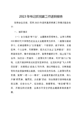 2023年书记抓党建工作述职报告按照会议安排,现将2023年度抓基层党建工作情况报告如下:一、履职情况(一)全力推进学干改,主题教育思想争先。以学习贯彻XXX新时代中国特色社会主义主题教育为抓手,一是强化联动学习。在渠道载体上五学覆盖:干部领学、班子研学、支部促学、个人自学、专家辅学;在方式方法上五学联动:原文原著系统学、集中领读重点学、聚焦专题研讨学、线上线下结合学、知行合一贯通学。二是强化开门教育。利用家门口阵地,扎实开展多种形式的宣传宣讲活动,让党的声音飞入寻常百姓家;发挥群众阅卷人的作用,通过专题会议、台账通报等形式自觉接受群众监督,切实形成良性互动。三是强化民生实绩。聚焦一老一小一青壮,认真落实重点民生实事,深入开展听民意、解民忧、办实事活动;结合党建引领网格化基层治理,在安全生产、信访稳定、舆情管控、保交楼等方面,开展拉网式排查,以高水平安全护航主题教育高质量开展。(二)聚力擦亮金名片,基层治理民生优先。一是压实五星支部创建工作。按照年初目标,依托领导包保、专班推进、挂图作战、网格融合、评比激励等机制,争创五星社区两个,四星社区六个,三星社区四个,三星以上支部占比100%。同时,打造*、*等一批党建品牌,*党委书记被评为2023年度市级百优书记,2家企业获评*市两新组织党建工作示范点,*社区荣获全国最美志愿服务社区,*社区荣获全国五四红旗团支部称号。二是抓实网格化管理工作。科学划分二级网格*个、三级网格*个,*个微网格,专属网格*个,实现条块下网、业务入网。创新110网格巡查、四色联调、双评双议机制,不断规范问题排查、发现、交办、处置、反馈、评价六步工作法;打造网格数治平台、红色物业示范平台、*平台、联盟党建平台等四大平台,逐步实现基层治理看得见、管得了、效果好。三是做实社会治理服务工作。依托*治理平台,累计孵化培育社区社会组织*支,开展活动*余场。将项目立在居民群众认可的刀刃上,设置街道特色项目3个,社区基础项目20个,分类推进社区服务十件微实事项目,以社区服务项目化实现社区服务专业化。街道*社区暖心驿站项目荣获*区优秀项目称号,*社区幸福家园项目在首届中华慈善数字公益节上全国推广。(三)致力拓宽共富路,基层党建成果领先。一是书记项目助推产业发展。以党建赋能、服务提效,全力打造高质量现代化产业街区为选题,聚焦*科创产业一条街建设,突出做强政府招商、平台招商、产业链招商、全员招商的四方招商,今年以来,共引进总部企业*家,科创型企业*家,*成功上市,*逆势增长,营业额突破*亿元。另外,树牢项目为王理念,严格落实重大项目指挥部、街道、社区(村)、企业四方协同和科级干部、分管科室、属地社区分包联系制、项目周例会推进机制,持续深化万人助万企活动,举办*2023年首届贸易新业态+数字赋能产业发展论坛、企业沙龙、政策直通车等活动,推动街区产业更新、经济可持续发展。二是精细化管理赋能城市风貌。高质量完成2023年10个老旧小区改造任务,实现楼院、道路面子里子双提升。对标六化要求,加大市容环境重点区域管控、数字化案件处置,突出抓好道路机动车违法停放、占道经营、生活垃圾分类、爱国卫生等专项整治,街道荣获全市爱国卫生银杯和城市精细化管理红旗街道称号。坚持绿色引领,5个在建工地全面落实8个100%标准,巩固了空气质量。三是党建带团建发挥青春力量。通过校企联合、高校直通车、人才招聘等多种举措,完成辖区1400名高校毕业生就业任务,同时开展好人才政策宣传宣讲、讲好青年创业故事,爱在郑州·相约季系列活动等,打造*、*、*、*等人才基地,指导*拍摄人才宣传视频。二、主要问题(一)主题教育还有一定差距。责任意识有待提高。从近期工作来看,部分党组织书记对主题教育工作的重视程度、政治敏锐性和自我加压还不够,将主题教育与业务工作结合的还不够紧密,存在走形式、走过场的苗头和倾向。学用结合还不够扎实。部分党组织存在理论学习中思考不深入、发现问题不够,与实际工作有机结合不精准。个别党组织对五项措施抓的不严不深,工作标准还需进一步提高。解决问题还需加大力度。个别党组织解决问题缺乏针对性和钉钉子精神,不愿触及深层次矛盾、担当不够,对于基础较差、短时间难以见效的工作抓得不够、措施不力、成效不明显。(二)基层治理还有进步空间。党建引领网格化治理工作还需进一步提升。因微网格网格员队伍均由辖区热心党员、群众、楼栋长担任微网格长,大多数年龄偏大,对智能设备的操作、事件流转等不熟练,使用网格化智能终端处理问题能力不强。党建引领五星支部创建还需进一步提高。虽然各社区能够抓牢五星支部创建各项任务,但仍有个别党员先锋模范作用发挥不突出,部分