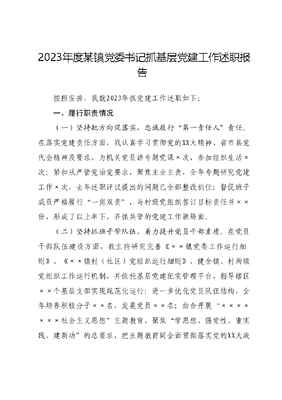 2023年度某镇党委书记抓基层党建工作述职报告按照安排,我就2023年抓党建工作述职如下:一、履行职责情况(一)坚持把方向促落实,忠诚履行第一责任人责任。在落实党建责任方面,我认真学习贯彻党的XX大精神、省市县党代会精神及要求,为机关党员讲专题党课×次,参加组织生活×次;紧扣从严管党治党要求,聚焦主业主责,全年专题研究党建工作×次,去年述职评议提出的问题已全部整改到位;督促班子成员严格履行一岗双责,与村级党组织签订目标责任书××份,形成了以上率下、齐抓共管的党建工作新局面。(二)坚持抓班子带队伍,着力提升党员干部素质。在党员干部队伍建设方面,我主持研究完善《××镇党委工作运行细则》、《××镇村(社区)党组织运行细则》,健全镇、村两级党组织工作运行机制,并依托基层党建纪实管理平台,指导辖区××个基层支部实现规范化运行;进一步优化党员队伍结构,全年培养积极分子××名,发展党员××名;结合开展×××××××社会主义思想主题教育,聚焦学思想、强党性、重实践、建新功的总要求,把主题教育同全面贯彻落实党的XX大战略部署有机结合,努力实现以学铸魂、以学增智、以学正风、以学促干,期间举办专题培训××余期、覆盖×××人,组织全镇党员干部到××××、××××××、××专题学习党建工作经验做法,先后选派各级干部××余人赴××××、×××、××××等地培训,党员干部能力素质不断提升。同时围绕县委县政府的重要决策部署,召开××镇党委会研究落实措施,形成局年度重点工作任务清单,严格跟踪督办重点任务落实情况。以深入开展形式主义官僚主义专项整治为抓手加强作风建设,教育引领全体党员干部强化大局观念,提升狠抓落实能力,确保党中央的决策部署和省、市委的重要工作要求得到全面落实。(三)坚持抓基层夯基础,切实筑牢基层战斗堡垒。在基层党的建设方面,我坚持党建引领,统筹推进各项工作。扎实开展双报到,协调解决问题诉求×××个,确保社会大局持续平稳;以×××××为目标,完成×个居住区××××工作室建设;在深化××××社区党建品牌的基础上,以点带面,以线促面,打造×××××基层党建品牌,带动全镇党建工作水平提升;以×××××为主题,抓好××××××××治理,协调推进城乡社区治理工作,打造乡村振兴示范线,初步实现乡村有变化、群众有感受;重点推进×××××建设,其中××××××被评为市级示范校,×××果蔬园被评为市级示范基地;建立×××××社会综合治理工作法,2023年全省雪亮工作现场会来××镇现场观摩。(四)坚持除顽疾转作风,全力营造崇廉尚实环境。在党风廉政建设方面,我牵头制定《××镇2023年落实党风廉政建设责任清单》,将党风廉政建设任务逐项分解到班子成员、各所室以及××个村(社区),明确责任主体、责任内容和考核办法;紧扣×××××主题教育,带头深入联系村讲专题党课×次,引导广大党员和全体干部牢固树牢四个意识;扎实推进专项治理微腐败工作,全年立案审查×件,处理党员干部×人。二、存在的主要问题认真反思我在管党治党方面存在的问题,主要有三个方面:一是党建责任压得不紧实。对落实基层党建工作标准还不够高,督导还不够严,对部分领域和个别村(社区)党建工作还指导不够深。二是干部监督管理抓得不严格。在从严整治上仍存在失之于宽、失之于软的问题,特别是基层干部监督管理方面力度不够。三是能力素质提升做得不到位。面对农博园建设的重大发展机遇期,部分干部能干事的本领不足、会干事的方法欠缺、干成事的决心弱化。深刻剖析原因,我认为主要有以下三点:一是思想认识不足在形成聚精会神抓党建的思想自觉和行动自觉上,与从严管党治党的要求仍有差距。二是创新思考不够。习惯用旧方法老套路开展工作,贴近新常态要求的课题不多,在工作上系统性针对性不强,钻研还不够。三是执行力度不强。在把方向、厘思路上做得多,工作要求提得多,亲力亲为、抓深抓细、跟踪问责做得不够。三、下一步工作措施下一步,我将对表党的XX大要求,强化四个意识,把党建工作扛在肩上、抓在手上,以开展×××××××××××××社会主义思想主题教育为契机,提升××党建水平,进一步夯实党在基层的执政基础。(一)在建机制抓落实上下功夫。牢固树立抓好党建就是最大政绩的理念,进一步提升党建工作质量,逐级分解任务,突出抓好对村(社区)党组织书记履行管党责任的考核,做到每月研究党建工作不少于1次,每季度专题研究推动党建工作落实1次。(二)在创特色建精品上下功夫。围绕乡村振兴、社区发展治理等工作,在××××农博园周边努力培育一批上档次、有活力、管长久的农村党建品牌,努力成为全县农村党建工作排头兵(三)在强保障促长效上下功夫。加大党建工作人财物投入以××××农博园建设和农村股份制改革为契机