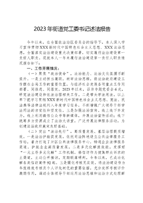 2023年街道党工委书记述法报告今年以来,在全面依法治区委员会的指导下,本人深入学习宣传贯彻XXX新时代中国特色社会主义思想、XXX法治思想,全面落实法治建设重大决策部署,切实履行法治建设第一责任人职责。现就本人一年来履行法治建设第一责任人职责情况报告如下:一、工作开展情况:(一)聚焦政治使命,法治能力、法治文化氛围不断提升。一是主动担当履职。树牢法治思维,将法治政府建设工作摆在全局工作的重要位置,与经济社会发展各项重点工作同部署、同推进、同落实。2023年以来,召开专题党委会6次,研究法治建设和依法治理相关工作。二是带头学法用法。以上率下把学习贯彻XXX新时代中国特色社会主义思想、宪法、民法典等法律法规列入年度学习任务,不断增强广大领导干部学法用法的自觉性和坚定性。三是加强法治宣传。线上线下齐发力,线上利用微信公众号等新媒体,开展法治宣传活动;线下统筹多方资源成立了法治大讲堂,广泛开展法律服务活动,为创建法治政府奠定良好基础。(二)突出法治先行,高质量发展、基层治理提质增效。一是法治护航促发展。依托司法阵地设立公共法律服务工作站,着力打造了片区公共法律服务中心,畅通企业法律服务渠道,护航企业高质量发展。二是多元化解提效能。发挥好一元主导多元化解工作机制,将信访作为搜集群众诉求的主渠道,主动公开接访,定期联席研判,今年以来,已成功化解各类信访案件92起。三是强化考核见实效。将法治建设作为年度绩效考核及个人评先树优的重要依据,充分发挥考核评价激励作用,调动全体领导干部运用法治思维和法治方式处理解决问题。(三)围绕建章立制,依法行政、依法决策水平不断提高。一是健全制度体系。率先制定了《街道法治政府创建工作实施方案》、《关于推进街道、村社区重大事项合法性审查机制的实施意见》,以文件形式明确了法治政府建设方案和合法性审查流程,今年以来,已累计审查合同100余件,其中审查街道重点项目合同3件。二是构建大调解格局。建成调委会25个,其中街道调委会1个,村社区调委会24个,创新五位一体矛盾分流化解机制,邀请全国模范调解员参与指导村社区疑难案件的纠纷处置,筑牢了稳定第一道防线。三是多方联动齐发力。整合法律顾问、基层法律服务工作者、人民调解员等多方资源,建立公共法律服务队,助推法治建设深入基层一线。二、存在问题:虽然法治建设工作取得了一定成效,但是距离彻底打通法治建设最后一公里还存在一定差距。一是法治政府建设工作开展缺乏创新。法治政府建设推进中,树立法治典型、发现亮点不多,对典型经验的发现、总结和推广不够及时。二是普法的宣传氛围不够浓厚。普法依然以传统方式为主缺乏新的方式、方法,全民普法的广度、深度远未达到要求。三、下一步工作打算:一是建立健全法治工作相关制度,不断提升法治观念和意识,定期组织开展法律和党内法规等集中学习,增强对法律、法规认识的广度和深度。二是持续用好党内法律顾问和一村(社区)一法律顾问制度,指导、援助各项工作,确保各项工作开展合法、合规,树立良好法治政府形象。三是创新普法宣传方式。联合各社区开展针对性普法活动,创新云普法等方式,营造知法、守法、学法、用法的法治氛围。