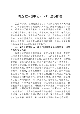 社区党支部书记2023年述职报告2023年以来,在街道党工委、办事处的正确领导和大力支持下,我紧紧依靠社区党员和广大群众,团结带领党支部一班人,以维护辖区稳定为重点,以改善居民生活为目标,以发展社区经济为中心,履职尽责、攻坚克难,解放思想、奋发进取,创造性开展工作,认真完成了街道党工委、办事处交办的各项任务,取得了显著成效,社区党支部、居委会在群众中威信得到进一步提高,支部凝聚力战斗力不断增强。现将一年来主要工作和廉洁自律方面的情况汇报如下。一、深入扎实开展xx,把学习成果转化为指导实践、推动工作的强大力量始终坚持把讲政治摆在首位,自觉加强党性修养,把对党绝对忠诚作为工作的首要政治原则、个人的首要政治品质,不断淬炼对党绝对忠诚的政治品格。深刻把握xx学思想、强党性、重实践、建新功的总要求,用好四下基层这个重要抓手,努力在以学铸魂、以学增智、以学正风、以学促干方面取得实实在在的成效。切实抓好理论学习和调查研究。坚持读原著、学原文、悟原理,感悟思想伟力、汲取奋进力量,用党的创新理论凝心铸魂,统一思想,以理论上的清醒确保政治上的坚定。突出问题导向和实践特色,紧扣发展所需、改革所急、基层所盼、民心所向的问题,深入调查研究,打通堵点、破解难点、消除痛点,打开事业发展新局面。切实检视整改突出问题。将检视整改摆在突出位置,对标党风要求找差距、对表党性要求查根源、对照党纪要求明举措,把一个个问题清单转化为成效清单,化为群众实实在在的获得感。切实办好惠民利民实事。树立和践行造福人民的政绩观,深入居民中间,到群众身边办实事、解民忧,着力解决好老百姓的急难愁盼问题,持续提高民生品质,以民生温度检验xx深度。二、全面加强党的建设,提升党组织政治功能和组织功能基层党组织是党的组织体系中的精神末梢,是党的组织体系的重要基石。坚持扎实推动社区党支部和网格全面创A,推动党组织全面进步、全面过硬。抓好xx工作固本培元,锲而不舍、久久为功。全面增强党组织政治功能和组织功能,始终把政治建设摆在首位。加强支部班子建设,强化党支部政治功能,夯实组织基础,发挥党组织战斗堡垒作用;集体研究班子内部分工,使支部委员摆好站位、找准定位、发挥作用;建设学习型党组织,提升领头雁服务能力、带富能力;提高政治站位、增强责任担当,坚持层层压实责任、逐级传导压力,制定责任清单、任务清单,确保任务到岗、责任到人。加快建设忠诚干净担当的高素质干部队伍。加强支部党员教育,督促广大党员学习贯彻xxxx融入日常、抓在经常,学习党的创新理论、业务工作知识,明确目标任务,强化党性锻炼,夯实初心与使命,使政治素养和业务能力得到进一步提高。激发广大党员干部干事创业热情,引导党员比贡献、比担当、比作为,不断开创事业发展新局面。三、坚持制度建党,提升党的组织体系建设整体效能积极履行党支部书记抓xx第一责任人职责,抓好新形势下社区xx工作,严格执行三会一课制度,按规定开展组织生活会、xx工作例会等,推进讲政治与抓业务有机统一,深度融合。落实落细三重一大、民主评议党员制度、民主组织生活会制度等,规范基层组织工作。通过开展与党员谈心谈话,交流思想,了解动态。做好四个长效机制的贯彻落实,加强社区党员的教育和管理,充发挥党员的先锋模范作用,不断增强党支部的凝聚力和战斗力。完善制度体系建设,按照基层组织工作条例有关要求,结合自身实际,进一步健全完善制度,不断提高党的组织建设的制度化、规范化、科学化水平。建立xx带团建、带妇建工作机制,确保各项工作落实到实处。对街道党工委关于xx工作的指示要求第一时间传达,第一时间部署,第一时间落实,确保政治方向正确、工作提质提效。通过专题学习、理论学习、主题党日活动,认真学习xxx精神和xxxx,引导广大党员用党的创新理论武装头脑、凝心铸魂、统一思想,不断增强四个意识、坚定四个自信、做到两个维护。四、深化xx引领基层社会治理,推动基层高质量发展以xx为统领,通过强体系、建机制、解民困,充分发挥社区联合党委职能作用。建立社区+网格+楼栋+单元四级组织体系,建立议事会学习会机制,探索一户一档一行动三个一模式,开展窗帘行动关爱独居老人。19名双三长通过观察独居老人窗帘变化、视频通话、敲门查看等方式守护25位老人平安,提供社区保姆式服务。以书记一号工程为号角,与8家包保单位签订xx联盟协议。采取研、商、领、宣四步工作法,推动书记项目落地见效。我们深入研究群众所需问题,分类列出清单,做成项目书;登门拜访包保单位,商定项目;包保单位结合自身能力认领书记项目;对办结快、效果好的项目利用公众号、抖音公众平台广泛宣传。端午节前夕,社区包保单位联合开展了迎端午念党恩·百家宴邻里一家亲活动,居民们分享着美食