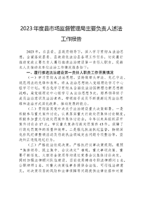 2023年度县市场监督管理局主要负责人述法工作报告2023年,在县委、县政府领导下,深入学习贯彻A法治思想,全面落实县委、县政府依法治县各项工作任务,切实履行推进党政主要负责人履行推进法治建设第一责任人职责。现将本人及推动本单位法治工作情况报告如下:一、履行推进法治建设第一责任人职责工作开展情况(一)学习贯彻A法治思想。坚持做带头学法、克己守法、规范用法的先锋和表率,将A法治思想纳入党组理论学习中心组学习计划,常态化学习贯彻A全面依法治国新理念新思想新战略,局党组理论中心组学习A法治思想3次,培养领导班子成员法治意识及法治素养,带领班子成员不断提高运用法治思维和法治方式深化改革、推动发展的能力。(二)贯彻落实党中央关于法治建设重大决策部署。一是积极参与重大案件讨论,认真落实重大行政处罚集体讨论制度,积极参加重大行政处罚案件集体讨论会,今年以来共组织召开案件讨论会17次,审议重大复杂行政处罚案件43件,保障了行政处罚案件的质量和效率。二是强化执法执纪监督,持续深化作风纪律整顿活动及行政执法领域突出问题专项整治等,坚决纠正违规违纪行为。(三)严格依法依规决策。严格执行议事决策规则,遵照集体领导、民主集中、会议决定准绳,重大事项决策、重要干部任免、大额资金使用等均通过党委会议集体讨论决定。同时加强法律顾问队伍建设,目前我局聘请专职法律顾问1名,公职律师1名,对重大决策性事务提供合法性、可行性法律意见,对决策项目的风险和法律保障等问题提供法律依据和对策措施,完善依法决策机制,确保决策程序的合法性。今年我局没有重大行政决策事项。(四)深入推进依法执政。深入推进依法行政,严格落实行政应诉、复议制度,带领局党组对行政复议案件进行专题研究,分析原因,明确方向。全力支持人大、政府、政协开展工作,自觉接受人大监督,对各级人大代表建议和政协委员提案及时予以答复。2023年以来共办理人大代表建议1条、政协提案7件。认真对待人民法院的司法建议,对检察机关的检查建议书第一时间进行查证落实。2023年办理检察建议书1份。认真贯彻落实《领导干部干预司法活动、插手具体案件处理的记录、通报和责任追究规定》,无一起领导干部违规干预行政执法活动、插手具体行政案件处理的情形发生。(五)依法全面履行政府职能。一是扎实开展专项整治,组织了行政执法领域突出问题专项整治活动、民生领域案件查办铁拳行动及食品药品安全专项治理行动等,严厉查处了一批重点典型案件,取得很好社会效果。二是强化综合监管,加大对乱收费、价格欺诈、虚假宣传、侵犯知识产权等侵害人民群众和企业利益违法行为的查处力度,2023年度,我局共办理一般程序案件871件。三是优化法治营商环境。坚持包容审慎原则,认真落实支持企业高质量发展17条措施、减罚免罚清单等柔性执法措施,已办理免罚及不予处罚案件98件,减轻处罚案件15件,从轻处罚案件435件,取得了良好的社会效果。四是坚持依法、规范、高效处理市场监管领域投诉举报,积极推进依法分类处理信访诉求,大力推进在线纠纷解决机制建设,切实推动消费纠纷源头化解。投诉接听率、办结率、举报按时核查率均为100%,有力维护了消费者合法权益。(六)深入推进法治宣传教育。制定市场监管系统八五普法计划普法责任清单和普法计划,广泛开展主题普法宣传活动。举办市场监管领域法律法规专业知识讲座,执法人员深入企业,围绕食品、药品、特种设备安全等内容,将理论宣讲与市场监管业务培训相结合,讲解相关法律法规,引导经营主体养成主动学法、自觉守法、遇事找法、解决问题靠法的意识。结合民法典宣传月、国家宪法日、安全生产月及315消费者权益保护日、知识产权宣传周等主题普法宣传活动,通过法律咨询、宣传展板展示等多种形式,向群众开展生动的普法宣传,有效营造全民学法守法用法的浓厚氛围。二、部署推进法治建设中存在的突出问题主要表现在:基层法治能力建设有待进一步提升,基层市场监管执法人员普遍存在知识储备不足和执法能力偏弱情况,与全面深入推进市场监管工作规范化、法治化还有一定的差距;对法治市场监管发展趋势和规律把握不深入,推进法治市场监管建设力度仍需不断加大,运用法治思维和法治方式解决能力仍需提高;创新力度不够,行政执法过程中落实宽严相济、法理相融原则,让行政执法既有温度又有力度仍需不断创新和探索。三、下一步工作打算一是紧抓法治建设的关键少数。严格落实党政主要负责人履行推进法治建设第一责任人职责规定,推动负责人带头尊法、学法、守法、用法;加强法治建设督导考评和责任追究,切实增强广大干部群众重法治、抓法治、强法治的政治意识和责任意识。二是加强法制培训和普法宣传的力度,充分运用案例研讨现场教学等通俗易懂的方式开展法治培训,进一步提升依法行政能力。加大普法宣传六进力度,把普法工作送到各行各业。三是严格规范公正文明执法