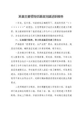 某县主要领导抓基层党建述职报告一年来,在市委、市政府的正确领导下,我始终坚持××××××××的理念,自觉带领班子成员认真履行党建工作职责,努力探索新形势下基层党建工作与中心工作紧密结合的新路子,为全县经济社会又好又快发展提供坚强的组织保证。一、认真履行职责,努力形成基层党建工作合力严格按照党要管党、从严治党要求,健全责任体系,规范运行机制,确保基层党建工作责任明确,领导有力。一是身体力行带头抓。坚持把基层党建工作摆在突出位置,列入重要日程,与经济工作同部署、同检查、同考核。今年以来县委常委会先后×次对基层党建议题进行专题研究和部署,有力推动了全年目标任务的落实。积极带领县四大班子党员领导建立基层党建联系点,平时能带头深入基层一线了解情况、听取意见建议,对基层党建工作进行经常性指导,并在县委全委会、全县领导干部大会等会议中,对新时期加强基层党组织建设提出具体要求。二是明确责任分级抓。及时调整党建工作领导小组,各地各部门成立相应的领导小组,形成了县、镇、村三级党建工作责任网络,形成上下联动、齐抓共管的工作局面。年初制定基层党建工作计划,召开全县党建工作会议,对基层党建工作进行全面部署。每年与各直属党(工)委签订强基工程目标责任书。对照责任书,出台考核细则,认真开展检查验收,并将考核结果纳入年度目标考核内容。三是强化保障合力抓。将基层党建工作经费列入县镇两级财政预算,形成合理增长机制,今年县级财政用于基层党建经费达×××万元。加强党建工作力量保障,优化镇(街道、区)组织委员队伍。着力加强阵地保障,在确保各村(社区)按××××标准建好活动场所的基础上,探索建立非公网格党群服务中心,确保党建活动阵地全覆盖。二、强化工作措施,努力增强基层党建工作实效严格按照基层党建工作责任制要求,强化措施,狠抓落实,切实为全县经济社会又好又快发展提供坚强组织保证。一是基层组织建设年活动扎实开展。以开展基层组织建设年活动为契机,不断深化创先争优活动。对全县×××个基层党组织进行分类定级并整改落实,×××个基层党组织实现了晋位升级。收集汇总了×××多个基层组织建设年创新案例、典型事迹和务实管用制度,表彰了××个创先争优先进基层党组织和××名创先争优优秀共产党员,在全县营造了学先进、赶先进、创先进的浓厚氛围。积极开展党员关爱月活动,募集党员关爱基金××多万元,七一前夕,走访慰问了全县建国前老党员、贫困党员和×××户低保和低保边缘户,发放党员关爱基金××万多元、生活困难党员帮扶基金××万元,构建了帮扶困难群众、共创共享和谐的经常性机制。二是基层党组织建设全面加强。加强农村党组织规范化建设,全面推行党群议事会×××制度。大力推进非公企业党组织组建工作,非公党组织组建率达××%。新增社会组织党组织×个,覆盖社会组织××个新建专业合作社党组织×个,开创了全县非公经济和社会组织党建工作的新局面。深入开展××××活动,×个机关党组织和×名党建指导员获市×××活动先进党组织和优秀党建工作指导员荣誉称号。三是党员教育管理规范创新。按照发展党员十六字方针推行了发展党员纪检、公安等部门联合审查制,严把党员入口关,同时注重党员发展数量和结构,确保了新党员质量。积极探索党员出口机制,新增××个党员出口机制试点单位。加强党员动态管理。建立组织、公安、人社等部门信息共享机制,及时发放流动党员活动证,加强流动党员双向管理。三、坚持改革创新,努力提升基层党建工作水平积极鼓励创新,在努力做好规定动作的同时,创新了一些自选动作,扩大了基层党建工作的影响力。一是积极探索农村、社县党建工作新模式。创新农村基层党组织设置。围绕农村特色产业发展,探索专业合作社党建工作,把农村党支部建在产业链上,党小组建在致富项目上。注重双强型党组织书记培养,提出了村书记队伍建设选任、培训、管理、激励四大机制。二是积极探索两新组织党建工作新途径。非公有制经济和社会组织党建方面,提炼了五一工作法,通过一本案例示范、一种模式推进、一项活动提升、一支队伍指导、一个阵地保障,进一步激活党组织活力。开展××××活动,通过送政策解发展难题,送法律解维权难题,送招聘解用工难题,送培训解技术难题,送平安解安全难题,送和谐解维稳难题和送温暖解生活难题,促进机关转变作风,更好地服务企业、服务发展。三是积极探索共产党员发挥先锋模范作用新形式。开展一周党员秀活动,在相城党建网以及各镇(街道、社区)门户网站开设专栏,通过图片、文字和视频形式,宣传农村、社区、非公经济组织等领域一线党员的先进事迹,秀品德、秀技能、秀观点,以身边人身边事为榜样,展示新时期共产党人的良好形象和精神风貌。一年来,在基层党建方面努力做了一些工作,也取得了一些成绩,但与上级的要求和群众的期盼相比,