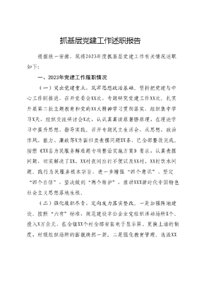 抓基层党建工作述职报告根据统一安排,现将2023年度抓基层党建工作有关情况述职如下:一、2023年党建工作履职情况(一)突出党建重点,筑牢思想政治基础。坚持把党建与中心工作同推进,召开党委会XX次,专题研究党建工作XX次。扎实开展第二批主题教育和党的XX大精神学习贯彻落实,组织集中学习X天,组织交流研讨会X次,认认真真读原著悟原理,在理论学习中提升思想、指导实践。召开专题民主生活会,从思想、政治作风、能力、廉政等X方面归类查摆问题XX条,已全部整改完成。按照《XX县为民服务解难题专项整治实施方案》要求,认真查摆问题,切实解决了XX、XX村夜间出行不便以及XX村、XX村饮水问题。践行为民服务根本宗旨,进一步增强四个意识、坚定四个自信,坚决做到两个维护,推动XXX新时代中国特色社会主义思想落地生根。(二)强化履职尽责,定向发力落实整改。一是加强阵地建设。按照六有标准,规范建设非公企业党组织活动场所X个。投入X万余元,在全镇XX个村全部安装电子显示屏、更换上墙的制度,村级组织场所的面貌焕然一新。二是强化教育管理。选派XX名村两委正职参加省市县培训,开展镇级集中培训XX次。接收预备党员XX人,开展党员志愿服务活动XX次。三是增强基础保障。拨付党建专项经费XXX万元,严格资金使用管理。(三)示范引领带动,构建齐头并进格局。一是组织召开全镇农村党组织书记三比一争活动动员部署大会,掀起比忠诚、比干净、比担当,争做新时代乡村振兴领头雁的热潮。组织XX个村每月定期开展四合一拉练,互相学习基层党建、产业发展、乡村治理等方面的典型做法。在XX个村进行了观摩拉练参观了XX蘑菇、XX葡萄种植基地和XX村壮大集体经济商业综合楼等项目,进一步启发村党组织书记开拓新视野新思路,充分营造了比学赶超的浓厚氛围。二是发挥村级党组织带头作用,促进集体经济增长。清理集体不规范合同XX份,追缴欠款、承包款XXX万元。申报扶持壮大村集体经济项目X个,新建1个占地X亩的连栋葡萄种植大棚和X个总占地XX亩的蔬菜大棚。XX村集体流转土地XXX亩,与投资公司合作,以土地入股,种植药材,预计收益XX万元。XX村种植油菜花XXX亩,促进乡村旅游业;种植苹果XXX余亩,初步形成规模。XX村种植山楂XX余亩,树下经济已获收益XX万元。XX村成功举办第X届XX节,各项经营性收入XXX万元。此外,还严格落实四包一整顿措施,整改软弱涣散基层党组织1个,注重提升党建整体水平。二、存在问题及原因分析当前在抓党建工作中还存不少问题,主要体现在:一是党建工作习惯通过召开会议、下发文件安排部署,在实地调研、督导检查上做得不够深入。二是个别村级党组织不能很好将党建工作与中心工作对接,在推动发展中谋划党建工作站位不高,主动性不强。三是对党组织和党员的教育管理工作重视不够,抓得不实一些支部三会一课制度落实不够规范,个别党员宗旨意识薄弱,党性纪律观念淡化。分析上述存在问题的原因,主要是有两个方面:一是认识不深刻。思想上还存在一些抓党建工作比较虚、抓经济发展才实的偏差,没有真正把抓基层党建工作作为最大政绩来对待。二是缺乏韧劲。聚精会神抓党建不够,面对繁杂日常的工作,应付较多,静下心来钻研、沉下身去调研相对较少,对有些存在的问题没有盯着解决。三是督办问责不到位。在对党组织书记的考核中,问责惩处不够坚决,导致少数基层党组织负责人缺乏压力和动力,存在一手硬、一手软的问题。三、2024年党建工作谋划2024年我将不断提高认识、创新方法,提升党建履职水平,推动主题教育走深走实,突出抓好基层党组织和党员队伍建设两个重点。一是带头落实管党治党责任。严格落实年初承诺、年中总结年末评议工作机制,明确党委及基层党组织抓党建的责任清单,推动村级党组织书记切实履行第一责任人的责任。二是提升发挥党组织示范引领作用。引导各村党组织开拓思路、解放思想、创新发展,推广XX村与投资公司合作成立第三方公司集体流转土地运营模式,跟进XX村医养项目、XX村集体建设用地项目进展,促进村级集体经济增长。三是提升基层党建整体水平。高标准推进支部标准化规范化建设,对照《党支部工作条例》,集中开展党支部设置整改规范,研究制定党支部考核评价办法,建立党支部工作责任清单,每季度至少听取1次党支部工作情况汇报。加强对农村党员的日常教育管理,严格落实党建工作年会,做好2024年度工作部署。我将继续以党建工作为引领,助推镇域各项事业发展,助力乡村振兴发展,探索产权制度改革新模式,为建设美丽富裕XX添砖加瓦。