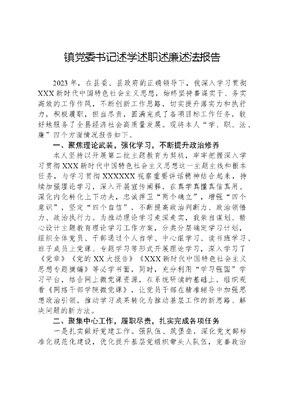 镇党委书记述学述职述廉述法报告2023年,在县委、县政府的正确领导下,我深入学习贯彻XXX新时代中国特色社会主义思想,始终坚持善谋实干、务实高效的工作作风,不断创新工作思路,切实提升落实力和执行力,积极履职,担当尽责,圆满完成了各项目标工作任务,较好地服务了全县经济社会高质量发展。现将本人学、职、法、廉四个方面情况报告如下。一、聚焦理论武装,强化学习,不断提升政治修养本人坚持以开展第二批主题教育为契机,牢牢把握深入学习贯彻XXX新时代中国特色社会主义思想这一主题主线和根本任务,与学习贯彻XXXXXX视察重要讲话精神结合起来,持续加强理论学习,深入开展宣传阐释,在真学真懂真信真用、深化内化转化上下功夫,忠诚捍卫两个确立,增强四个意识,坚定四个自信,不断提高政治判断力、政治领悟力、政治执行力。为推动理论学习走深走实,我亲自谋划、精心设计主题教育理论学习工作方案,分类分层确定学习计划,组织全体党员、干部通过个人自学、中心组学习、读书班学习、班子成员上党课、专题学习等形式开展理论学习,深入学习了《党章》《党的XX大报告》《XXX新时代中国特色社会主义思想专题摘编》等必学书面,同时,充分利用学习强国学习平台,结合网上微党课资源,在系统研读的基础上,组织观看《网络干部学院微党课》,让党员干部在精准辅导中加强思想政治引领,推动学习成果转化为推动基层工作的新思路、解决问题的新方法。二、聚集中心工作,履职尽责,扎实完成各项任务一是扎实做好党建工作。强队伍、筑堡垒,深化党支部标准化规范化建设,优化提升基层党组织带头人队伍,完善政治荣誉、经济奖励、政策倾斜等激励机制,举办专题培训班,全覆盖轮训村(社区)、两新组织等领域基层党组织书记。组织开展牢记嘱托先锋有我等活动,引导党员在急难险重工作一线当先锋、做表率。强阵地、优服务,深入推进党群服务中心服务体系功能建设,建立需求、资源、项目三张清单,做实在职党员报到、微心愿认领等工作,有力整合撬动各方力量资源,丰富服务载体,拓展服务内容,构建起镇、村两级党群服务中心体系。建机制、聚合力,组织镇机关、下属事业单位、优质企业、社会组织,与全镇28个村、社区全覆盖手拉手结对共建,共谋推进乡村振兴、基层治理等重点工作,带动社会资本投资5000万元,谋划实施农业产业化项目8余个,帮助解决问题400余个。二是扎实开展产业振兴行动。坚持以党建引领产业发展,通过抓特色、壮龙头、强品牌、优结构、促融合等途径,加快转变农业发展方式,使农业产业发展由一般转向特色,由低效转向高效,由粗放转向精细,切实提高农业发展的质量和水平。目前,已培育形成5万亩特色红薯、7万亩优质鲜果、4万亩绿色蔬菜、2万亩优质核桃、2000万棒绿色食用菌等产业基地,特色农产品占比在80%以上,全镇村级集体经济收入1000余万元,收入超20万元和50万元的村分别为10个和18个,均达到或超过2022年全年水平。三是扎实推进农村人居环境整治。紧紧围绕建设宜居宜业和美乡村目标,以2023年农业农村工作要点中确定的9个美丽乡村、6个五化村庄、3个标准化村庄为重点,结合乡村标准化和美丽庭院建设,结合各村历史文化和基础特色,综合利用清、理、拆、改、建等多方面措施,在全域范围内深入开展以硬化、净化、亮化、绿化、美化为目标的村容村貌环境整治。同时,重点抓好村庄主要街道、重要节点和公共场所打造、违规违建和残垣断壁拆除、小微游园建设以及环村林带、连村林带建设等工作。今年以来,镇党委、镇政府积极发动群众,组织人员、动用机械,清理柴草、生活垃圾、建筑垃圾14250余立方米,清理残垣断壁225处,改造提升卫生厕所1543座,高标准打造成了小游园、小菜园、小果园等微景观。四是扎实推进乡村振兴人才储备。举办2023年高素质农民培育电商专题培训班,组织农业合作组织、新型经营主体、农业企业营销部门负责人及业务骨干等40余人参加培训,突出场景化学习,让学员在学中用、在用中学,进一步提升农村电子商务网络认知能力,普及了农产品电子商务知识与技能,缓解农产品的卖难问题,助力乡村振兴、推动农村经济发展中的积极作用。今年以来,全镇累计投入资金100万元,培训高素质农民100余人,全部纳入人才储备库管理,一支有文化、懂技术、善经营、会管理的高素质农村人才队伍正在成长。五是扎实作为惠民利民工作。开展民呼我为办实事、接诉即办解难题、助力纾困暖人心等为民服务活动,通过健全12345热线来电接听、现场解答(或转办督促)、分析通报、满意归档和承办单位诉求受理、办理落实、限时回复、办结归档双闭环机制,积极回应群众诉求。全年记录回应群众问题建议1200余条,梳理问题46个,已全部办理解决,群众满意度达到95%以上。突出问题导向,围绕民生诉求等9个方面深入