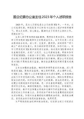 国企纪委办公室主任2023年个人述职报告2023年,是本人任职纪委办主任的第XX年。一年来,在公司党委纪委,特别是X书记和X书记的关心爱护和培养教育下,我立足本职、安心敬业,圆满完成了纪委办公室的工作。现报告如下:1.深入学习贯彻党的XX精神,理想信念更加坚定。坚持把学习贯彻党的XX精神作为首要政治任务,与中央纪委二次全会精神结合起来,深入学、反复学、跟进学,深刻领悟两个确立的决定性意义,努力做到学思用贯通、知信行统一。对学习贯彻党的XX精神情况进行监督,推动党的XX精神走进各直属党组织、走进广大党员、在公司落地生根。积极参加学习贯彻XXXX。全面深入学习XX,深刻领会XXXXXX关于新闻出版工作的重要讲话和重要指示批示精神。配合公司党委纪委对XX开展情况进行监督,推动各直属党组织高质量完成教育任务。2.突出加强政治监督,确保党的领导落实到末端。深入贯彻落实XX,聚焦政治监督,确立调研课题、成立调研小组,对XX公司、XX中心及西南XX家单位进行调研,认真梳新闻出版工作中发现的问题,特别是一些政治性、倾向性等影响出版安全的问题,剖析检视问题产生的根源,提出改进建议,推动建立定期通报和奖惩机制,进一步完善规章制度,切实守好意识形态阵地,确保党媒姓党。加强对材料供应、印刷制作、图书营销、数字项目等重点领域和关键环节的监督检查,找准找实纪检工作的着力点。落实纪检干部参加各直属党组织组织生活会制度,加强对各直属党组织增强政治功能、推进政治建设、落实政治责任情况的监督检查,效果明显。3.严明党的政治纪律和政治规矩,切实担当起公司纪委在坚决做到两个维护上肩负的重大责任。加强对上级党组、纪检监察组联合制定的政治纪律七严禁、八不准规定的学习以及各直属党组织贯彻落实情况的监督检查,认真贯彻执行《纪检监察干部网络行为十条禁令》,确保公司党员干部在政治立场、政治方向、政治原则、政治道路上同党中央保持高度一致。强化对党员干部政治言行特别是网络言行的政治引领和规范约束,紧紧盯住破坏党的政治纪律和政治规矩的具体人和事,坚决防范和解决七个有之问题,督促推动公司各直属党组织和党员干部高度自觉地把党的XX作出的各项战略部署落到实处。4.扎实做好日常监督,做好了风险防控工作。突出加强日常监督和持续监督,让监督没有死角、没有空白、没有间断。切实把关口前移深探,通过建立和完善各项制度,让抓早抓小、防患未然制度化、规范化、经常化。下发《关于梳理部门廉政风险点的通知》,对各部门廉政风险点进行梳理,完善《公司廉政风险防控手册》内容。参与公司组织的印厂盘库、图书报废、纸张采购等业务工作,在监督生产的同时提高了纪检干部的业务能力。监督营销中心制定《营销中心退货、调货办法》,完善了相关制度。9月份,在书记带领下,与党办一起对西南XX家单位全面从严治党暨党风廉政建设工作进行了检查。按照要求登记并上报《公司纪委监督执纪情况统计表》。5.严格落实经常性警示教育,一体推进党员干部不敢腐、不能腐、不想腐。组织警示教育暨新任职中层干部集体廉政谈话会。向各直属党组织下发《中国共产党处分违纪党员批准权限和程序规定》《中央和国家机关党员干部违纪违法案例选编》《关于加强监督执纪坚决查处酒驾醉驾案件背后四风问题的通知》;在元旦、春节、清明、端午等节日,通过纪检工作微信群及时进行节日廉洁提醒,紧盯易发多发问题和隐形变异问题,加强监督检查,防止四风问题出现。协助公司党委开好2023年党风廉政建设工作会议,监督各直属党组织开展经常性好警示教育。参与公司报废图书相关情况的调查,并指出存在的问题、提出针对性意见,促使营销中心采取积极措施,修订完善了《公司图书报废管理办法》,堵塞了漏洞,防患于未然。6.加强自身建设,不断提高履职能力。认真学习XX,全力投入纪检监察干部队伍教育整顿,加强实践锻炼,提高政治判断力、政治领悟力、政治执行力。制定并下发《公司2023年党的纪检工作要点》,严格按照内容要求开展工作。组织公司纪委委员到河南焦裕禄干部学院,参加为期一周的学习贯彻XXXX读书班暨业务研修班;认真学习《中央和国家机关部门机关纪委工作规则》,依据《规则》及时梳理、修订纪委履职相关制度,进一步规范和细化工作程序、审批权限等,健全完善纪检工作制度体系;认真贯彻执行《党组关于印发锲而不舍落实中央八项规定精神深化纠治四风的实施办法》,持之以恒正风肃纪,营造风清气正良好氛围;认真开展违规办案行为专项整治工作和案件质量问题专项整治工作,不断提高了专职纪检干部做好新形势下纪检工作的能力。按照纪检监察干部教育整顿领导小组下发的《纪检监察干部应知应会党内法规和国家法律清单》,组织专兼职纪检干部学习,有效提高了大家的法规法律意识和依法执纪能力。