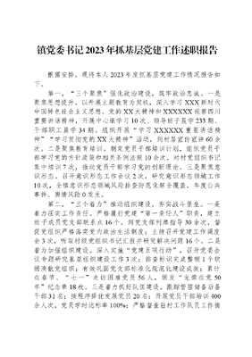 镇党委书记2023年抓基层党建工作述职报告根据安排,现将本人2023年度抓基层党建工作情况报告如下。第一,三个聚焦强化政治建设,筑牢政治忠诚。一是聚焦思想提升。以开展主题教育为契机,深入学习XXX新时代中国特色社会主义思想、党的XX大精神和XXXXXX视察四川重要讲话精神,开展中心组学习10次、领导班子晨学233期、干部职工晨学34期。组织开展学习XXXXXX重要讲话精神学习贯彻党的XX大精神活动,到村居宣传宣讲60余次。二是聚焦教育培训。制定党员干部培训计划,组织党员干部学习党的方针政策和相关条例法规10余次,对村党组织书记集中培训7次,推动党员干部学习党的创新理论。三是聚焦意识形态。召开意识形态工作会议2次,研究意识形态领域工作10次,全镇意识形态领域风险排查防范化解全覆盖,年度公共事件、舆情风险0发生。第二,三个着力推动组织建设,夯实战斗堡垒。一是着力压实工作责任。严格履行党建第一责任人职责,建立班子成员党支部联系点16个,到党支部列席指导30余次,督促党组织严格落实党内政治生活制度;主持召开党建工作调度会3次,听取村级党组织书记汇报并研究解决问题16个。二是着力加强组织建设。深入实施党建五项行动,召开党委会议专题研究基层组织建设工作3次;排查标识完成整顿1个软弱涣散党组织;有效巩固党支部标准化规范化建设成效;累计在春节、七一走访困难党员56人,颁发光荣在党50年纪念章18枚。三是着力抓好队伍建设。跟踪管理储备后备干部31名;按程序择优发展党员20名;开展党员干部培训400余人次,党员学时达标率100%;严格督查驻村工作队员工作情况,调整3人;组织离退休干部座谈2次;到村督查村(社区)干部工作情况80余次。第三,三个持续推动党建工作,提升治理能力。一是持续推进乡村振兴。以党建为引领,推进党组织领办合作社进程,争取东西部协作资金650万元,开工建设刺梨生产园区4000平方米;生产刺梨产品6.2万斤、种植收获天麻60万余斤,累计产值1700余万元;积极推动特色产业发展,村集体经济逐步积累。二是持续推动基层治理。年度接访群众304人次,解决群众急难愁盼事项199件;发挥党员先锋模范作用,化解矛盾纠纷40余起;开展培育文明新风村村行动、户户落实行动,召开院坝会等60余次,酒席滥办、环境脏乱等得到有效治理。三是持续开展疫情防控。按照乙类乙管管理措施开展组织联建,划分疫情防控网格15个,混编区直部门干部、镇村两级干部161人,排查发现重点人群4790余人,发放健康包2760余份,疫情防控坚实防线有效筑牢,群众生命健康安全得到保障。第四,三个抓实推动主体责任落实,抓好作风建设。一是抓实党风廉政建设。召开党风廉政工作专题会议8次;集中约谈干部2次130余人次,个别约谈5人,党内警告处分1人,党内严重警告1人,查处侵害群众利益问题1起。持续整治腐败和不正之风。二是抓实干部作风整顿。强化镇村两级干部监督管理,开展民生监督检查50余次,发现整改问题3个;开展警示教育3次。三是抓实整顿违规参与营利性活动。开展干部职工及其家属参与营利性活动整顿,排查整改问题5个,着力守牢纪律底线。针对去年上级书记点评指出的3个问题,通过加大督促指导力度、挖掘本镇现有资源、科学制定干部培训计划等措施完成整改。针对去年查摆的3个问题,通过改进教育培训方式强化教育、对党组织书记持续加强培训、围绕中心打造特色党建品牌完成整改。2023年我镇不涉及巡视巡察反馈问题和党委班子带队检查全面从严治党指出问题。虽然一年来做了大量的工作,也取得了一些成效,但仍然还有需要进一步改进的地方。一是压力传导不够深入。推动一岗双责在个别党组织落实的不够到位,形式主义在一定程度上还存在。个别党组织对基层党建工作的推进没有走深走实,存在上传下达、读读文件等情况,在如何创新、推进上没有认真系统谋划。导致党员干部党性教育开展效果不好、党员干部的党性修养不强。比如,被列为软弱涣散党组织的长沟村党支部由于先前党组织书记空缺,相关党组织成员对相关工作不熟悉,有关工作落实不够到位,对基层党建工作的推进没有走深走实,使得对党员的教育培训没有认真谋划,党员党性修养不强。二是管理力度不够强。对干部职工的考核制度未完全建立,导致干部职工对自身综合素质的提升不够重视,自我要求不够、约束力不强,存在工作学习上的惰性,履职尽责能力还有待加强。比如,当前对干部职工的考核方式较为单一,相关考核制度未完全建立,缺少细化指标,对干部考核起来难,使得干部职工对提升自身综合素质不够重视。三是村(社区)干部带富能力不足。在发展村级集体经济时,主要由村(社区)干部代行管理职能,但大部分村(社区)干部经济管理能力和管理效率等难与集体经济发展要求相匹配。比如,当前所有村(社区)集体经济主要
