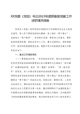 XX党委(党组)书记2023年度抓基层党建工作述职情况报告XX党委(党组)始终坚持以XXX新时代中国特色社会主义思想为指导,深入学习贯彻党的XX大精神,衷心拥护两个确立,忠诚践行两个维护,坚持稳中求进,聚焦XX工作重点,聚焦抢抓XX政策机遇,紧扣区委中心工作,着力巩固深化、狠抓薄弱环节,推动XX党建高质量发展。现将今年以来抓基层党建工作情况报告如下:一、重点工作落实情况(一)聚焦政治引领。一是突出政治引领,强化政治XX建设把坚决贯彻落实XXXXXX重要指示批示精神作为忠诚践行两个维护的最XX接体现,坚持第一遵循抓贯彻、第一政治要件抓落实。深入开展对党忠诚和政治XX意识教育,教育引导区XXXX各基层党组织和XX党员深刻领会两个确立的决定性意义增强对两个确立的政治认同、思想认同、情感认同。二是突出政治定力,强化政治理论武装。坚持把学习贯彻XXX新时代中国特色社会主义思想作为第一任务,强化XXXXXX关于加强XX党建工作重要论述和视察XX重要讲话精神、新XX文件精神,及时跟进学习XXXXXX最新重要讲话精神。制定党XX理论学习中心组年度学习计划,认真落实第一议题、理论中心组学习制度,今年以来开展集中学习XX次,集中研讨XX次。依托XX开展青年党员理论学习读书班,进一步强化青年党员的政治培训和政治教育。举办XX区贯彻党代会·喜迎XX大·建功新XX知识竞赛,以赛促学。三是突出政治任务,认真学习宣传贯彻党的XX大精神。在区XXXX迅速掀起学习宣传党的XX大精神热潮,把学习贯彻党的XX大精神作为首要政治任务和长期战略任务,全面系统学、深入思考学、联系实际学。以领导班子带头学、党员干部全员学、退休干部上门送教学的方式实现党员干部全覆盖学习,以原文学、专题讲座辅导学,专题研讨深入学等多形式推动党的XX大精神的学深学透(二)聚焦责任引领。一是认真贯彻落实《中国共产党党和国家XX基层组织工作条例》,印发《XX区2023年区XXXX党的建设工作要点》,进一步扣紧压实抓党建责任链条。二是全力抓好XX基层党组织书记抓基层党建述职考核评议工作,组织召开XX区年度区XX机关基层党组织书记抓基层党建工作述职评议会,有效传导压力,压实XX各基层党组织书记抓基层党建的责任。三是认真落实《党委(党组)落实全面从严治党主体责任规定》,督促指导部门党委(党组)、XX党委、党支部拟定2023年度全面从严治党责任清单和党建工作清单。四是督促班子成员认真履行党建责任制,严格执行基层党建工作联系点制度,强化对XX基层党建工作的指导、督促和检查,推进XX基层党建工作进一步制度化、规范化和标准化。五是严格落实意识形态工作责任制始终坚持把学习贯彻XXXXXX关于意识形态工作重要论述纳入XX政治理论学习的日常自学内容。做好意识形态领域形势综合分析研判,积极防范化解重大风险,坚决守住安全底线。强化网络意识形态管理,引导XX干部自觉规范工作时间内外、线上线下言行。(三)聚焦组织引领。一是严肃党内政治生活。严格执行重大问题请示报告、个人重大事项报告制度,严格规范民主生活会组织生活会、三会一课、民主评议党员等党内政治生活制度严格执行领导干部双重组织生活制度,切实增强党内政治生活的政治性、时代性、原则性、战斗性。二是规范基层党组织设置。严格做好党员发展工作和党员档案核查认定工作。今年来审批确定入党积极分子XX名,发展对象XX名,预备党员XX名,预备党员转正XX名,举办两期党员发展对象短期集中培训班。三是持续推进党支部标准化规范化建设。XX个申报创建XX的党支部和11个标准化规范化建设示范点党支部完成区级复核。强化业务提升,进一步提升XX党务工作者的能力素质和业务水平,提高落实新时期XX党建工作新任务、新要求的履职能力,切实把全区XX党建工作推上新台阶。(四)聚焦作风引领。一是严格落实党风廉政责任制。将XXXXXX关于全面从严治党的重要论述和系列重要讲话精神,中央省、市、区历次纪委全会精神以及警示教育片、违纪违法典型案例、中央八项规定精神和党规党纪等纳入学习计划,对XX党员干部和公职人员进行正确的权力观、政绩观教育,提升拒腐防变和抵御风险能力。组织全体干部职工学习XX违纪违法等典型案例,用身边事教育身边人,使党员干部从反面典型中受到警示教育。观看党员干部酒驾警示教育视频,签订XX区党员干部、公职人员严守纪律、杜绝酒驾和严禁违规操办或参与状元酒等承诺书提高党员干部廉洁自律意识,引导党员干部增强政治定力,筑牢思想防线。今年以来观看警示教育片XX次,组织学习典型案例通报XX次,召开警示教育会议XX次。二是认真落实关于整治形式主义为基层减负、改进作风狠抓落实各项任务。切实转变作风、提高效能,严控发文同比下降率为XX和会议数量在合理范围内。三是制定《XX作