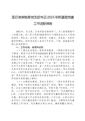 区行政审批局党支部书记2023年抓基层党建工作述职报告2023年,在区委、区政府的坚强领导下,本人紧紧围绕中心发展大局,深入学习贯彻XXX新时代中国特色社会主义思想,抓组织、带队伍,抓作风、强素质,抓重点、求突破,全面加强党的建设,较好地完成了各项工作任务。下面,我就基层党建工作述职如下:一、工作总结、成绩和经验(一)强化政治意识,筑牢思想根基。一是践行常态化学习制度。把学习宣传贯彻XXXXXX重要讲话精神作为学习教育的重要内容,坚持先学一步,学深一层。全年共召集党员和积极分子参与线下学习10次,线上分享学习篇目10余篇。二是建立学习型党支部。严格落实三会一课、党员冬训、固定学习日等学习教育活动,进一步深化全体党员理想信念。全年共召开党支部委员会10次、支部党员大会8次,带头讲党课4次。三是开展宣传教育活动。开展了学习XX大,清风颂廉洁等系列活动,全面提升政务服务效能和水平,以实际行动贯彻落实党的XX大精神。(二)加强组织建设,落实主体责任。一是抓实党员队伍建设。开展树岗位先锋创十星党员活动,建设一支素质优良、业务过硬的窗口服务先锋队伍,积极开展村村到、户户进、人人访集中走访活动,入户走访20余户,形成调研报告1篇。二是抓实纪律作风建设。始终把党风廉政建设摆在突出位置,推动全面从严治党向纵深发展。今年以来,分别与班子成员签订《党风廉政建设工作责任书》10份。专题研究党风廉政建设工作10次、党风廉政分析会10次、廉政提醒会10次,廉政提醒谈话100余次。三是抓实意识形态建设。制定《意识形态工作责任清单》,签订《意识形态工作责任书》10份,有序推进全局意识形态工作。全年召开意识形态专题会议10次、其中意识形态工作分析研判会12次,排查风险点1000条。(三)坚持党建引领,优化营商环境。充分发挥党建示范引领作用,推进党建+模式,提升群众满意度,助推营商环境持续优化。一是党建+项目,打造三级政务服务体系建设书记项目,全面建成区、街、村社三级政务服务大厅。目前,全区10家街道、72家村社区全部入驻500区旗舰店,共认领政务服务事项清单50项,开展网上办件50件。二是党建+业务,推出营商环境意见码流动审批服务台审管联动等创新举措,聚焦群众急难愁盼问题,上门审批,简化流程,真正做到服务群众、服务企业。三是党建+服务,按照手续从简、办事从快、服务从优的原则,推行容缺登记承诺制受理帮办代办等机制,最大限度地满足群众办事需求。截至目前,告知承诺制事项累计办理100件。二、抓基层党建方面存在的突出问题一党建工作责任制落实不够到位。有时仅仅满足于出思路定目标,在抓落实上下的功夫不够,投入时间精力不足,缺乏精益求精、追求卓越的劲头。没有真正管到位、严到家,抓党建、带队伍的标准有待进一步提高。二是党建工作机制不够完善。在党员的教育管理制度和激励约束机制等方面还需进一步完善,在抓党建工作实施落实方面,号召力还需继续加强,推动力有待提升。三是党建工作内容不够丰富。党内组织生活缺乏创新意识和手段,吸引力和凝聚力不够。对党员的思想教育缺乏针对性,教育内容枯燥,方式方法相对较为单一,缺乏生机和活力,党建工作的载体创新不够特色。存在以上问题的原因,一是思想认识不够深刻。作为党建工作第一责任人的意识还需加强,对开展党组织活动的重要性要有更充分的认识。在忙于事务性工作的过程中容易忽视与群众面对面的交心谈心。二是缺乏深入的调查研究。在工作谋划上,由于调研不够细致、思考不够充分等原因造成党建上少数工作停留在表面,缺乏针对性、吸引力、硬措施和强手段。三是解决问题缺乏创新。在面对复杂问题和局面时,守摊有余,创新不足。惯用老办法、老眼光看待和解决问题,只满足或只看到一种答案,不能积极思考多种应对措施。三、2024年度书记抓基层党建工作的思路、重点和措施一是聚力增强党组织政治功能。严格落实党组中心组学习制度,定期开展书记讲党课,充分用好学习强国固定学习日等媒介,依托线下党课、线上平台,提高增强党性修养的自觉性,切实做到知难而进,有效推动党建工作落实。二是聚力建立健全党建工作机制。把党建作为机关整体工作的重要组成部分,统筹安排,定期研究,督促党员领导干部严格按照一岗双责要求,形成党建与业务工作齐抓共管的工作责任机制。认真落实三会一课制度,加强对党员的教育管理。充分发挥党员先锋模范作用,继续实行好党员示范窗口、党员示范岗等党建工作激励机制,继续开展好树岗位先锋创十星党员活动,更好地激发党员的参与热情和创造活力。三是聚力创新举措打造特色品牌。以党建引领优化政务服务体系为目标,持续夯实党组织战斗堡垒,以项目化抓党建,以品牌化推党建,发掘打造特色党建品牌。充分发挥引领效应、示范效应和融合效应,进一步推动党建与