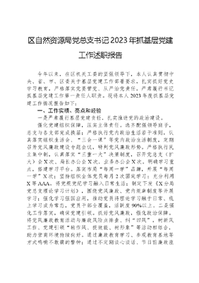 区自然资源局党总支书记2023年抓基层党建工作述职报告今年以来,在区机关工委的坚强领导下,本人认真贯彻中央、省、市、区委关于基层党建工作部署要求,扎实抓好党史学习教育,严格落实党要管党、从严治党责任,严肃履行书记抓基层党建工作第一责任人职责。现将本人2023年度抓基层党建工作情况报告如下:一、工作实绩、亮点和经验一是严肃履行基层党建责任,扎实推进党的政治建设。强化党建组织保障,压实主体责任。选齐配强领导班子,总支与各支部完成换届;严格执行党内政治生活若干准则,认真落实组织生活会、三会一课等党内政治生活制度,定期召开党风廉政建设专题会议,研判党风廉政形势。严格执行民主集中制,认真落实三重一大决策制度,召开党总支(扩大)会X次、局长办公会X次,业务办公会X次。明确学习重点,搭建学习平台。落实市局每周一学品牌,开展每周一学X次;坚持组织全体党员每月2次固定学习;充分利用X等AAA,将党规党纪学习融入日常生活;制定下发《X分局党总支理论学习计划》,围绕党风廉政、党内规章制度等开展学习;强化学习强国应用,推动党员将理论学习融于日常、线上学习成为常态,党员干部全覆盖,活跃度90%以上。二是强化工作落实,确保党建引领。抓好党风廉政,强化政治保障。将党风廉政教育活动与廉政风险点排查、纠四风,树新风工作、党建引领转作风、提效能、树形象等活动相结合,助力营商环境持续向好。通过廉政教育学习、参观教育基地等方式鸣响不敢腐的警钟;通过不定期谈心谈话、节日前廉政座谈、述职考核、跟踪做好廉政风险点监督管理等手段,扎好不能腐的笼子;通过学习各类反面典型,做好廉政文化建设,带领党员算好人生七本账等方式,营造不想腐的氛围。为更好服务地方经济发展提供坚强的政治保障。落实专项行动,加强传承帮带。分局主要负责人携年轻干部,躬身入局换位体验办事流程,从中发现问题、查找不足,找准流程中难点、堵点,完善措施、提升服务,查找问题并落实整改;创立导师成长责任制,为每名年轻干部配备专职成长导师,结合主题党日等活动,请导师和学员结合工作实际,全面细致讲解自己及对方所负责的业务,确保业务流程全员熟知。此外分局领导还专门设计针对性强、复杂度高、操作要求灵活的综合性业务讨论题,供大家学习讨论。在大家踊跃发言、观点碰撞的同时,以具体案例激励、引导同志们学会换位思考,提升业务水平与办事效率,进一步优化营商环境,深化党建与业务融合。二、抓基层党建方面存在的突出问题回顾今年以来的党建工作,在全体党员干部的支持和配合下,取得了一定的成效,但仍存在不少问题和不足,主要有以下几个方面:(一)党建责任落实不够到位。对履行抓基层党建工作落实第一责任没有完全到位,有时满足于形式上完成规定动作。同时在精力分配上,关注业务工作较多,没有投入足够的时间和精力去研究、谋划、部署党建工作,缺少对党建工作调研指导,未能真正沉下去,深入基层开展走访调研,忽视与所里部分同志面对面的交心谈心,对党建工作抓得不紧不细。(二)党内组织生活不够规范。对基层党组织管理缺乏力度,三会一课制度坚持不彻底,支部组织生活不健全,支部会议不规范不严肃。作为党总支书记组织召开组织生活会、谈心谈话、开展批评与自我批评不够经常化,党内生活质量不高。(三)党内监督管理不够严格。围绕履行党建工作责任制虽然建立了一些制度,但在实际运行过程中,疏于对党组织的日常监督检查,对执行情况缺少考核,问责发力不足,使得党建工作措施和目标配套不能完全落实。经过深刻的自我剖析,深入查摆,产生问题的原因主要体现在以下几个方面,一是对党建工作思想认识不够深刻。作为党总支部的带头人,在党建工作方面没有树立严的标准,没有充分认识党内政治生活的严肃性,对上级精神把握不到位,党性意识不足。二是以身作则不到位。重业务管理,轻党性教育,对党性教育重要性认识不足,不能经常参加党支部集体学习,没有较好的发挥表率和领导作用,对组织、对同志、对事业高度负责的精神还不够。三是管理制度不健全。缺乏有针对性、可操作性强的基层组织制度,党建监督管理机制不配套,缺乏有效的监管制约手段和激励问责机制,保障措施不到位。三、2024年度书记抓基层党建工作的思路一是抓好领导部署。带头履行一岗双责,进一步明确党总支部委员分工及主要职能,细化责任分工,坚持书记总抓、分工负责,形成责任明确、领导有力、运转有序、保障到位的基层党建工作机制,切实做好党员教育、管理、服务工作。二是抓好组织生活。严格执行三会一课制度,定期召开支部大会、支委会,通过集中学习、自学、帮学等方式,提高党员政治理论水平和责任意识。定期召开组织生活会和民主生活会,开展谈心谈话、开展批评与自我批评,使之成为一种习惯、一种自觉、一种责任,提高党内政治生活质量。三是抓好学习教育。坚持党员固定学习日制度,督促各