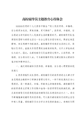 高校辅导员主题教育心得体会XXXXXX在党的十九大报告中提出使人民获得感、幸福感、安全感更加充实、更有保障、更可持续,获得感、幸福感、安全感成为评判新时代人民美好生活的重要标尺。高校辅导员队伍建设的目标与美好生活这一社会主要任务密切相关,两者在相互影响、相互构建中向前演进。高校辅导员对美好生活的认识、体验以及评价,直接关系到思想政治教育的效果,关乎大学生的成长与成才。因此,在高校辅导员队伍建设过程中,以获得感、幸福感、安全感为切入点,可为高校辅导员队伍建设提供必要的价值方向和精神动力。一、满足高校辅导员获得感、幸福感、安全感心理需要的现实意义1.获得感指引成长目标。高校辅导员的获得感是在从事大学生思想政治教育和日常事务管理过程中,一种不断发展的正向心理感受,是一种满足、幸福、积极向上的情绪体验。高校辅导员的获得感是在日常工作实践中由每一份获得而引起的满足感,满足高校辅导员的获得感是高校辅导员队伍建设的动力之一。通过不断增强高校辅导员的获得感,可以提升高校辅导员的职业自信和育人质量。高校辅导员在分析自身优势的基础上,准确定位职业目标,规划调整职业生涯,不断提升自身的政治素质和育人能力,能够增强自身的获得感。大部分高校辅导员在工作中不计回报、不吝付出,旨在做好青年的引路人。同时,他们在工作中可以实现双线晋升,不断增强其获得感,提升其职业自信心,进而更好地实现自身的人生价值。2.幸福感构建人文关怀。高校辅导员的幸福感来源于自身工作中的角色满足和认同,是其内在悦纳的一种心理感受。高校辅导员的幸福感表现在追求师生关系的融洽感、工作目标的实现感家长的认同感和社会的信任感等方面。高校辅导员的幸福感直接关系高校学生工作的开展成效,在幸福感的激励下,高校辅导员可以保持不竭的工作动力以及平和的工作心态,促进高等教育育人目标的最终实现。关注高校辅导员的幸福感,对于维护高校辅导员心理健康、提高思想政治工作质量、营造健康的教育环境具有重要意义。3.安全感彰显育人氛围。高校辅导员的安全感是高校辅导员在从事意识形态教育及学生管理等过程中的一种能动感受,是一种对稳定及安全的内外部环境的一种心理渴求。安全感是爱、尊重等其他心理需求的基础。只有在拥有足够多安全感的基础上,人们才能与他人建立充满信任且和谐的人际关系。外界提供的和谐氛围可以满足高校辅导员内心的安全感,群体间友好、共情、相互支撑,能够使他们在困惑时得到充分的理解与支持。高校辅导员队伍要形成团队协作的育人氛围,营造一个宽松、愉快的大思政工作体系。二、高校辅导员实现获得感、幸福感、安全感的制约因素获得感、幸福感、安全感是衡量高校辅导员工作的重要标准是新时代高校辅导员队伍建设的方向。要增强高校辅导员的获得感、幸福感、安全感,就要全面深入了解和把握影响其实现的制约因素。1.角色自我发展冲突导致获得感匮乏。随着网络时代的发展高校辅导员工作的变量与增量并存。高校辅导员的工作难度也在不断增加,从而引发个人获得感缺失、角色定位模糊等问题。高校辅导员所担任的角色复合性较高,他们同时承担着教师与管理人员的双重角色,而一个承担着复杂角色功能的职业角色必然容易产生角色内部冲突。高校辅导员的工作出现在高校各种教育和管理的场域,他们要不断满足不同群体的诉求,在这一过程中要频繁转换角色,与此同时,他们的时间又经常被压缩,这就使得高校辅导员在工作状态中充满了忙碌、疲倦和冲突感。高校辅导员的内部角色冲突会影响高校辅导员对职业的认可度,使得他们难以体会到职业自豪感,更谈不上实现工作获得感。2.工作时间边界模糊导致幸福感缺失。高校辅导员工作边界的模糊性、学生需求的多元性以及线上线下的交互性使得高校辅导员工作缺乏聚焦。很多人将高校辅导员工作描述为上面千条线,下面一根针,将高校辅导员看作是信息发布员、救火队员和高级保姆。在高校辅导员日常工作中普遍存在一种常态化、隐性的要求,即,他们不仅要无条件接纳,还要善于处理各种时间边界模糊的问题。学生工作无小事,从入职开始,高校辅导员手机都要保持24小时开机,保证有信号,确保随时随地能被联系到。这使得高校辅导员的工作生活与家庭生活的边界越来越难以区分,他们工作渗入了家庭生活中。职业生活和家庭生活不断地冲破各自的时间边界,弱化了高校辅导员的工作和生活界限间的心理屏障,使他们出现了幸福感缺失的现象。3.职业身份认同缺乏导致安全感不足。新时代发展要求高校辅导员既要组织好、实施好、指导好传统的日常思想政治教育和事务管理工作,又要能够因事而化、因时而进、因势而新,提升思想政治教育工作的时代感和吸引力,挑战不可谓不大。高校辅导员责任边界不清,工作职责被弱化为各种纯粹的日常事务,如学风建设被简化为学生挂科率高低,校园文化建设被简化为宿舍卫生检查,生涯规划被简化为学生就业率考研率。很多事务性工