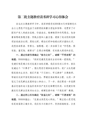 第二批主题教育读书班学习心得体会在这次主题教育学习中,我深切感受到XXX新时代中国特色社会主义思想不仅包括了治国理政的重大理论和策略,还贯穿了中国共产党人的政治品格、价值追求、精神境界和作风要求,包含着深厚的真理力量、实践力量和人格力量,增强了我对党的创新理论在政治认同、思想认同、理论认同和情感认同方面的认识。我坚持读原著、学原文、悟原理,进一步加深了对学思想、强党性、重实践、建新功总要求的理解,受到很大感染和启发。一、通过党建引领确定信念之向,破解不想发展的难题。XXXXXX指出:抓好党建是发展农业农村的一把钥匙。党建引领是确立农村发展方向的关键。我们在农村工作中,抓住党建这个牛鼻子,强化思想引领和组织领导,使广大农民增强发展内生动力。我们开展不忘初心、牢记使命主题教育,帮助农民树牢富民强县的信念,厚植发展的精神力量。这进一步坚定了农民群众发展的信心和决心。下一步,我们要进一步发挥基层党组织战斗堡垒作用和共产党员先锋模范作用,以党建引领激发农民群众发展内生动力,破解发展中的不想发展难题。二、通过民心所向确定致富之向,破解不愿发展的难题。XXXXXX指出:发展必须是民心所向。顺应民心是实现农民致富的正确方向。我们在乡村振兴中,坚持因地制宜、分类指导,充分调动农民群众积极性。针对山区农民对养殖业的需求我们大力发展山地特色养殖,农民人均收入显著提高。针对沿海农民对种植业的需求,我们发展设施农业和休闲农业,农民实现稳定增收。这进一步增强了农民的获得感和幸福感。下一步,我们要进一步从农民需求出发,因地制宜发展特色产业,不断增强农民在发展中获得感,破解发展过程中的不愿发展难题。三、通过开拓创新确定振兴之向,破解不会发展的难题。XXXXXX指出:创新是一个民族进步的灵魂。开拓创新是推进乡村振兴的根本途径。我们在乡村振兴中,大力推广农业科技进步,建立科技示范基地,选派农民赴外地学习先进技术,有效提升了农民科技文化素质和发展能力。我们鼓励农民创业创新,支持农民返乡创业,新注册各类农业产业化经营主体超过了2万家。这进一步增强了农民的获得感和自信心。下一步,我们要进一步加大科技支撑力度,大力培育新型农业经营主体,不断提高农民创新创业能力,破解发展过程中的不会发展难题。