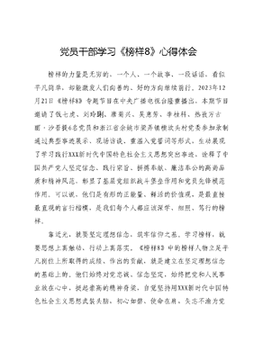 党员干部学习《榜样8》心得体会榜样的力量是无穷的,一个人、一个故事、一段话语,看似平凡简单,却能激发人们向善的、好的方向继续前行。2023年12月21日《榜样8》专题节目在中央广播电视台隆重播出,本期节目邀请了钱七虎、刘玲、唐菊兴、吴惠芳、李桂科、热孜万古琍丽·沙吾提6名党员和浙江省余姚市梁弄镇横坎头村党委参加录制通过典型事迹展示、现场访谈、重温入党誓词等形式,生动展现了学习践行XXX新时代中国特色社会主义思想突出事迹,诠释了中国共产党人坚定信念、践行宗旨、拼搏奉献、廉洁奉公的高尚品质和精神风范,彰显了基层党组织战斗堡垒作用和党员先锋模范作用。可以说,他们是有形的正能量、鲜活的价值观,是最直接最直观的言行楷模,是我们每个人都应该深学、细照、笃行的榜样。靠近光,就要坚定理想信念,筑牢信仰之基。学习榜样,就要思想上真触动、行动上真落实。《榜样8》中的榜样人物立足平凡岗位上所取得的成绩、作出的贡献,就是建立在坚定理想信念的基础上的。他们始终对党忠诚、信念坚定,始终把党和人民事业放在心中,挺起崇高的精神脊梁,自觉坚持用XXX新时代中国特色社会主义思想武装头脑,初心如磐、使命在肩,矢志不渝为党和人民事业不懈奋斗。正是这坚定的理想信念,为他们提供了充足的精神之钙,为他们提供了源源不断的精神动力,让他们在践行党的初心和使命的伟大征程上,勤耕不辍、奋勇前进。可以说,坚定的理想信念凝聚了他们的心神,让他们专心致志于党的伟大事业。作为新时代党员干部,我们要像节目中榜样人物那样时时刻刻绷紧理想信念之弦,时刻牢记党的根本宗旨,坚定拥护两个确立,增强四个意识、坚定四个自信、做到两个维护,不忘初心、牢记使命,经常检视自己的理想信念和思想言行,勤掸思想尘、多思贪欲害、常破心中贼,让榜样的感召力量引领我们大步向前走。追随光,就要学习先进典型,凝聚前进力量。实现中华民族伟大复兴,需要更多时代楷模。《榜样8》中的榜样人物,正是新时代奋斗在基层一线的共产党员中涌现出来的先进典型。作为新时代党员干部,我们要把先进典型作为引领的旗帜,循着先进的足迹前进、沿着先进的方向前行,争做榜样的忠实粉丝,以榜样为标尺,从里到外、从上到下丈量自身思想境界、素质能力和作风形象等方面与榜样的距离,让思想和行动时刻向榜样看齐,将榜样精神内化于心、外化于行;要把先进典型作为精神的源泉,弘扬他们的精神,学习他们立场坚定、忠诚可靠的政治本色,知重负重、冲锋在前的担当精神,秉公用权、无私奉献的过硬作风将他们的精神力量融入血脉,将他们的优秀品质注入体魄,把英雄的意志和信念转化为干事创业的强大精神动力;要把先进典型作为自省的镜子,以严格的标准要求自己、激励自己、约束自己主动对标先进典型,从中汲取奋进力量。成为光,就要坚守职责使命,勇于担当作为。见贤思齐,榜样就是旗帜,榜样就是方向学习榜样就要成为榜样。毋庸讳言,《榜样8》中的榜样人物都经历了新形势、新任务的考验,经历了各种困难问题和风险挑战的考验。但他们敢于担当、勇于负责,在苦干实干、默默奉献中砥砺千磨万击还坚劲的意志,激扬越是艰险越向前的精气神,知重负重、攻坚克难,在急难险重任务面前豁得出、顶得上,在有效应对重大挑战、抵御重大风险、克服重大阻力、解决重大矛盾中冲锋在前、建功立业,他们都经起了各种艰难险重的考验,是敢于涉险滩、爬陡坡的时代英雄。他们在各自领域、各自岗位上付出的艰辛努力、收获的骄人成绩,无不是敢于担当、勇于负责的结果。作为新时代党员干部,在学习榜样中要坚持以榜样为镜,以榜样为尺,学习榜样身上蕴含的气质和品格,学思悟结合,知信行统一,永远保持崭新状态、饱满热情和昂扬斗志,奋力书写更加灿烂绚丽的人生答卷,让自己成为榜样的样子。作为新时代党员干部,我们要学习榜样,把担当精神融入血脉,把自己的人生价值和祖国的强国事业联系到一起,同心同向同频共振,在工作岗位上认真履职尽责、无私奉献,展现属于我们这一代人的强国担当。