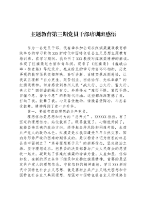 主题教育第三期党员干部培训班感悟作为一名党员干部,很有幸参加公司在红旗渠廉政教育学院举办的学习贯彻XXX新时代中国特色社会主义思想主题教育培训班。在学习期间,我聆听了XXX教授对红旗渠精神的解读,参观了红旗渠纪念馆和青年洞,观看了《红旗渠》《巍峨山碑·杨贵篇》等纪录片。亮点纷呈的学习内容环环相扣,历史再现的教学场景交相辉映,聆听讲解、目睹实景深刻感悟,让我真正理解自力更生、艰苦创业、团结协作、无私奉献的红旗渠精神,切身感受到林州人民战太行、出太行、富太行、美太行四部曲的强大有力,并感悟出难而不惧、富而不惑、自强不息、奋斗不息的新时代内涵。这些都深深震撼了我,打动了我,鼓舞了我,心灵备受触动,情操备受陶冶,斗志备受鼓舞,精神得到了进一步升华。第一,要做有崇高理想的共产党员。理想信念是思想和行为的总开关。XXXXXX指出,有了坚定的理想信念,站位就高了,眼界就宽了,心胸就开阔了,就能坚持正确的政治方向,经得起各种风险和困难考验,永葆共产党人的政治本色。红旗渠是在我国遭受三年自然灾害、国内外形势严峻的困难时期修成的,是以杨贵书记为班长的林县县委牢固树立了革命理想高于天的崇高信念,坚定政治立场,坚守理想追求,把县委的决策部署与广大人民群众的愿望统一起来,凝聚起了修建红旗渠的磅磷力量。人生如屋,信仰如柱。在新的历史条件下继承和发扬红旗渠精神,首要的是坚定共产党人的理想信念,守住信仰的精神高地。学习XXX新时代中国特色社会主义思想,就是要树立共产主义远大理想和中国特色社会主义共同理想,增强对中国特色社会主义的道路自信、理论自信、制度自信和文化自信,在全面建成小康社会、实现中华民族伟大复兴中国梦的历史进程中充分发挥先锋模范作用,用勤劳和智慧创造出色业绩,成就出彩人生。第二,要做一心为民的共产党员。全心全意为人民服务是我们党的根本宗旨,我们一切工作的出发点和落脚点是实现好、维护好、发展好最广大人民群众的根本利益。为什么林县的广大群众不怕苦险难,积极主动参与到这个历史上不可能完成的工程中呢?是因为红旗渠能够实现祖祖辈辈的林县人民想水、盼水的梦想,是得民心、合民意、为民造福的工程。有了人民群众的信任和支持,才能不为任何风险所惧,不被任何干扰所惑,不为任何困难所困。当前,公司正处在电网整合,新电网建设的关键期、也处在集团发展形势的严峻时期,作为基层党员干部,更要继承和发扬红旗渠精神,牢记全心全意为人民服务的宗旨,想职工之所想,办职工之所需,以实际行动取得职工的信任和支持,从而激发广大职工的凝聚力和创造力,立足本岗,开拓创新,共同为公司高质量发展奉献力量。第三,要做敢于担当的共产党员。敢于担当是中国共产党人的鲜明品格。XXXXXX指出,是否具有担当精神,是否能够忠诚履责、尽心尽责、勇于担责,是检验每一个领导干部身上是否真正体现了共产党人先进性和纯洁性的重要方面。红旗梁的修建从一开始就面临重重困难。杨贵书记没有丝毫退缩,他带领县委一班人以大无畏的气概,忍辱负重,勇于担当,做出了一个又一个改变林县历史的重大决策,使红旗渠最终得以建成,谱写了修渠引水、改变命运的伟大乐章。作为一名党员干部,在工作中要继承和发扬红旗渠精神,认真学习以杨贵书记敢于担当的高贵品质,以时不我待、只争朝夕的干劲,以锐意进取、敢作敢为的狠劲,以踏石留印、抓铁有痕的韧劲,身先士卒,率先垂范,做好电网的各项管理工作,在公司转型发展做出应有贡献。本次培训班学习虽然已经结束了,但我知道有更重的学习和工作任务在后面。思想在我们的头脑中,工作在我们的手中,坐而言,不如起而行。在今后工作中,我要以XXX新时代中国特色社会主义思想为指导,继承和发扬红旗渠精神,做一名坚定信念、一心为民、敢于担当的共产党员,用有效的管理、激情的干劲、谦虚的态度重新面对崭新的每一天,面对每一项工作任务,在工作岗位中发挥中坚骨干力量,为电网安全运行,为公司高质量的转型发展贡献自己的力量。