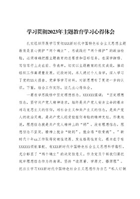 学习贯彻2023年主题教育学习心得体会扎实组织开展学习贯彻XXX新时代中国特色社会主义思想主题教育是衷心拥护两个确立、忠诚践行两个维护的政治检验,必须准确把握主题教育的总要求和目标任务,在深学细悟、笃信笃行上走在前、作表率,切实以主题教育的扎实成效,推动组织工作高质量发展。近段时间,本人通过个人自学,深入学习了党的XX大报告、党章等学习材料,对新思想有了更进一步的认识。下面,结合工作实际,谈几点心得体会。一要在学思践悟中坚定理想信念。XXXXXX强调:坚定理想信念,坚守共产党人精神追求,始终是共产党人安身立命的根本对马克思主义的信仰,对社会主义和共产主义的信念,是共产党人的政治灵魂,是共产党人经受住任何考验的精神支柱。形象地说,理想信念就是共产党人精神上的钙,没有理想信念,理想信念不坚定,精神上就会缺钙,就会得软骨病。新时代十年xx工作取得突破性进展、发生格局性变化,根本在于有XXXXXX领航掌舵、有XXX新时代中国特色社会主义思想科学指引,充分彰显了两个确立的决定性意义。作为党员干部我们要把筑牢理想信念作为终身课,坚持读原著、学原文、悟原理。把自主学习XXX新时代中国特色社会主义思想作为自己私人订制课,在读原著、学原文、悟原理上下功夫,做到深学深悟、常学常新,不断深化对党的理论创新成果的理解和把握,切实用XXXXXX系列重要讲话精神武装头脑、指导实践、推动工作。二要在细照笃行中提高能力本领。党的十八大以来,如果党没有全面增强以八种本领为主要内容的执政本领,党和国家事业就很难取得历史性成就、发生历史性变革。XXXXXX指出,学习新时代中国特色社会主义思想的目的全在于运用,在于把这一思想变成改造主观世界和客观世界的强大思想武器。作为党员干部,我们要把理论学习的成果转化为干事创业的实际行动坚持学以致用、用以促学、学用相长,不断锤炼想干事、能干事干成事的过硬本领;要将实践作为已有知识的检验场,去粗存精、去伪存真,坚持实践、认识、再实践、再认识的辩证发展过程,在实践中不断提升自身理论水平;要以解决实际问题的效果来检验学习的厚度、深度,以所学所知作为解决工作中难题的依据,认真分析产生缘由,善于运用马克思主义立场、观点方法解决实际问题。我们必须增强推动高质量发展的能力,服务于群众,并防范风险,化解问题。培养斗争精神和斗争本领是至关重要的。我们要走在前列,主动应对挑战,打破思维定势,改变传统观念。在自己的岗位上,我们需要运用深厚的知识,科学的策略,强大的能力,创新的勇气以及有责任心的态度,来做好推动高质量发展的各项工作。三要在知行合一中践行初心使命。学习贯彻XXX新时代中国特色社会主义思想主题教育工作会议上,XXXXXX再次强调了三个务必,指出要教育引导广大党员、干部务必不忘初心、牢记使命,务必谦虚谨慎、艰苦奋斗,务必敢于斗争、善于斗争,筑牢信仰之基、补足精神之钙、把稳思想之舵。其中,不忘初心、牢记使命,是党的十九大报告开门见山提出的重大命题,在党的XX大报告中又被重点强调,在这次主题教育中同样被着重强调,这既是对高质量开展主题教育提出的要求,也是向全党同志发出的号召。作为党员干部,我们要不忘初心、牢记使命立足xx实际,深入领会中央和省委市委的各项部署要求,尽快推动落地见效。要结合xx实际,加快推动xxx建设,着力解决人民群众急难愁盼问题,让老百姓从主题教育中切切实实得到实惠,把初心使命转化为实际行动。