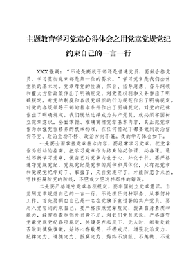 主题教育学习党章心得体会之用党章党规党纪约束自己的一言一行XXX强调:不论是高级干部还是普通党员,要做合格党员,学习贯彻党章都是第一位的要求。学习党章是我们全体党员的基本功。党章对党的性质、宗旨、指导思想、奋斗纲领和重大方针政策作出了明确规定,对党员权利和义务作出了明确规定,对党的制度和各级党组织的行为规范作出了明确规定,对党的各级领导干部的基本条件作出了明确规定,对党的纪律作出了明确规定。我们既然选择成为共产党员,就必须牢固树立党章意识,全面掌握、准确贯彻党章基本内容,真正把党章作为加强党性修养的根本标准,在任何情况下都要做到政治信仰不变、政治立场不移、政治方向不偏。我的学习体会如下。 一是要全面掌握党章基本内容。要经常学习党章,把党章作为行动的指南,把学习党章作为终身的必修课、必备课。通过不断学习党章,使自己对党章内化于心、外化于行。要严格遵守党规党纪,党规党纪是党章的延伸和具体化,只有把党章和党规党纪学好了、掌握了,又自觉遵守了,才能防患于未然,守住拒腐防变的防线,不犯或少犯这样那样的错误。 二是要严格遵守党章各项规定。要牢固树立党章意识,自觉用党章规范自己的一言一行,不论担任何种职务、从事何种工作,首先要明白自己是一名在党旗下宣过誓的共产党员,要用入党誓词约束自己。要严格按照党章规定,提高自身素质和能力,经常检查和弥补自身不足。对我们党员来说,严格遵守党章党规党纪各项规定,关键是在私底下、无人时、细微处能否做到慎独慎微,始终心存敬畏、手握戒尺,增强政治定力、纪律定力、道德定力、抵腐定力,始终不放纵、不越轨、不逾矩。 三是要对党有坚定不移的信仰。中国共产党从1921年成立到现在,带领中国人民从站起来到富起来,再到向强起来迈进,这是人类历史上第一个社会主义国家从一穷二白的起点出发,一跃成为世界第二大经济体,中国找到了自己的发展之路。今日之中国,在内忧外患中诞生,在磨难挫折中成长,在攻坚克难中壮大,中国从追赶到并跑,从胜利不断走向胜利,这是了不起的成就,我们党带领中国人民一路走来真是不容易,这也是我们党之所以伟大之处。我今年54岁,新中国成立的70多年风雨历程,我经历了一大半,我出生在农村,在小时候的记忆里,充斥着饥饿贫困,生活很艰辛。我从学生到士兵,从军人到地方,从农村到城市,经历过生产队、大包干、单干,经历过物资极度匮乏的年代,同时更见证了祖国的飞速发展,这些年,我们的生活发生了翻天覆地的变化,我深有感触、体会很深,这些都是我们党带领中国人民实实在在干出来的,但党内外也有少数人一边吃着肉,一边骂着共产党,这样是非常错误的。说实话,我的真心体会是没有共产党的正确领导,就没有我们每一个人今天的美好新生活,我永远跟党走,党就是我一生坚定的政治信仰。