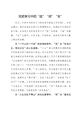 党史学习中的选调生近日,中共中央印发了《党史学习教育工作条例》,并发出通知,要求各地区各部门认真遵照执行。选调生作为党的后备干部,应自觉从百年党史学习中选定道路、调动激情、生长情怀,以史为鉴,开创未来,在新时代赶考之路上跑出好成绩。从一寸山河一寸血的苦难辉煌中,选定生也沙丘,死也沙丘的人生道路。七七烽火的警钟依旧映照着中华民族百折不挠的奋斗荣光;李大钊同志共产党万岁的就义呐喊还在耳畔回荡;红军战士踏过二万五千里艰难险阻的长征精神经过近百年的岁月更迭,仍熠熠生辉地激荡在我们的心田…… 勿忘昨天的苦难辉煌,无愧今天的使命担当,不负明天的伟大梦想。步入新时代,作为基层干部中坚力量的选调生们有了新的战场——田野乡村。既然接受了选调生的身份,就要走出象牙塔,沉淀泥土香,在基层扑下身子干实事,从百年党史的苦难辉煌中汲取精神力量,坚定立党为公、许党报国的忠诚信仰,选定基层山海,追风赶月莫停留,与基层实现双向奔赴。从人生无处不青山的壮志豪情中,调动直挂云帆济沧海的干事激情。百余年前,中国的新青年意气风发,挥斥方遒,用他们的青春和鲜血谱写了一段段可歌可泣的壮丽诗篇,也为我们留下了宝贵的精神财富。而今,时代飞速发展,中国青年为中华之崛起而奋斗的底色从未消退。民族要复兴,乡村必振兴。选调生立于基层的广袤天地,应当学习革命前辈勇于担当,甘于奉献的精神力量,在祖国最需要我们的地方日夜耕耘,积蓄成长能量,释放干事激情。惟属望于新鲜活泼之青年,有以自觉而奋斗耳!陈独秀的《敬告青年》振聋发聩,涕泣陈辞寄望于活泼之青年,让千万中国青年热血沸腾。选调生作为基层新鲜人,如初春朝阳,要调动活力与能力,才能在基层绽放绚丽的青春之花。从俯首甘为孺子牛的爱民本色中,生长但愿苍生俱饱暖的公仆情怀。什么是共产党?共产党就是自己有一条被子,也要剪下半条给老百姓的人。老人淳朴的话语,道出了中国共产党与人民风雨同舟、血脉相通的深厚情谊。中国共产党的百年党史是一部奋斗史。我们党从嘉兴南湖上的一舟红船,到如今的世界第一大党,百年烈火涅槃,百年奋斗征程,时移世易,万物更新,中国共产党员为人民服务的如磐初心从未褪色。XXXXXX强调,哪里有人民需要,哪里就能做出好事实事,哪里就能创造业绩。选调生站在新时代、文可居文库——海量学习资料,手机电脑均可下载www.wenkeju.com新起点,当传承红色基因,厚植公仆情怀,对人民群众念兹在兹,身入基层,心入群众,用实干践行我为群众办实事的责任担当,生长厚植为民情怀,以真心换真心,不负时代,不负人民,不负韶华。文可居文库——海量学习资料,手机电脑均可下载www.wenkeju.com