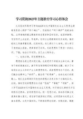 学习贯彻2023年主题教育学习心得体会扎实组织开展学习贯彻XXX新时代中国特色社会主义思想主题教育是衷心拥护两个确立、忠诚践行两个维护的政治检验,必须准确把握主题教育的总要求和目标任务,在深学细悟、笃信笃行上走在前、作表率,切实以主题教育的扎实成效,推动组织工作高质量发展。近段时间,本人通过个人自学,深入学习了党的XX大报告、党章等学习材料,对新思想有了更进一步的认识。下面,结合工作实际,谈几点心得体会。一、站稳立场,坚定理想信念。理想信念是立党兴党之基,也是党员干部安身立命之本,青年干部的健康成长,离不开信仰的明灯和理想的支撑。缺少了对实现社会主义和共产主义的理想信念,或者理想信念不坚定,我们就会在精神上缺钙,就会得软骨病。在成长成才的道路上,我们总会遇到形形色色的诱惑以及来自各个方面的压力。此时,惟有坚定的理想信念才能压舱掌舵领航。深入学习XXX新时代中国特色社会主义思想,对于我们认清时代方位领悟历史使命,坚定理想信念,统一思想行动,推动各项事业发展具有重大意义。通过学习我深刻认识到,必须坚持马克思主义基本原理,立足中国实际,不断推进理论创新、实践创新、制度创新,以马克思主义中国化最新成果统一思想、指导实践。我将牢记初心使命,坚定四个自信,自觉在思想上政治上行动上同党中央保持高度一致,用XXX新时代中国特色社会主义思想武装头脑、指导实践、推动工作,坚定中国特色社会主义共同理想和信念。二、勇于担当,发扬斗争精神XXXXXX指出:知者行之始,行者知之成。敢于负责、勇于担当最能体现党员干部的政治品格和党性作风。作为一名党员干部,必须知行合一、做实干家,在工作实践中弘扬担当精神,加强实践锻炼、真刀真枪打拼,多当几回热锅上的蚂蚁,在急难险重任务中经受摔打,以时时放心不下的责任感、积极担当作为的精气神履好职、尽好责。进入新时代,我国社会主要矛盾的变化,提出了更高的要求。作为共产党员,我们必须勇于担当甘于奉献,敢于斗争,以永不懈怠的精神状态和一往无前的奋斗姿态,把党和人民赋予的任务完成好。通过学习我深刻认识到,必须继续推进全面从严治党,坚决反对形式主义、官僚主义,坚持稳中求进工作总基调,推动全面深化改革,坚持以人民为中心的发展思想。我将不断强化四个意识,坚定四个自信,做到两个维护,以对党和人民事业高度负责的政治觉悟,发扬斗争精神,坚决反对一切形式主义、官僚主义,以永不懈怠的劲头抓好工作,以一往无前的姿态解决发展过程中的风险挑战。三、立足本职,做出工作成效今年是进入全面建设社会主义现代化国家、向第二个百年奋斗目标进军新征程的重要一年,我们党将召开XX大,这是党和国家政治生活中的一件大事。我们必须立足本职,做好自己的工作以实际行动推动各项事业不断取得新成就。我深刻认识到,全面建成小康社会、实现中华民族伟大复兴的中国梦任重道远。我们必须立足新发展阶段,贯彻新发展理念,构建新发展格局,推动高质量发展。我将进一步提高政治站位,牢固树立大局意识,深入贯彻XXX新时代中国特色社会主义思想,以对党和人民高度负责的精神,履职尽责,在推动经济高质量发展和社会事业进步上展现出新作为。下一步,我将结合工作实际,进一步提高政治水平和业务素质,增强文字功底和思维能力,强化协调意识和服务意识,努力成为可堪大用、能担重任的党办干部,以强烈的主动精神奋进新征程、建功新时代。通过此次学习,我将以崭新精神风貌和务实作风,推动各项事业在新时代取得新成就。