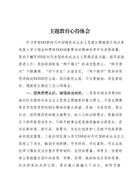 主题教育心得体会学习贯彻XXX新时代中国特色社会主义思想主题教育开展以来我深入学习领会和贯彻XXXXXX重要讲话精神和党中央决策部署,坚持不懈用XXX新时代中国特色社会主义思想武装头脑、指导实践推进工作,更加深刻领悟两个确立的决定性意义,四个意识不断增强、四个自信日益坚定、两个维护更加自觉坚决做到XXXXXX怎么说,我们就怎么做,不仅要做到,而且要做好。现围绕主题谈三点心得体会:一、提高思想认识,增强政治自觉。一是深刻领会开展XXX新时代中国特色社会主义思想主题教育的重大意义。开展主题教育是贯彻落实党的XX大精神的重大举措,是统一全党思想、意志行动,始终保持党的强大凝聚力、战斗力的必然要求,是推动党员干部积极担当作为,不断开创事业发展新局面的必然要求,是适应新形势、新任务、新要求,坚定扛起党和人民赋予的职责使命的现实需要。二是持续在深入学习XXX新时代中国特色社会主义思想上下功夫。做到学有所悟、学有所得、学到真经、学出成效把学习摆在突出位置并贯穿始终,坚持读原著、学原文、悟原理努力掌握蕴含其中的道理、学理、哲理,做到知其言更知其意、知其然更知其所以然,要在凝心铸魂上下功夫,始终沿着XXXXXX、党中央指引的方向前进。三是要把XXX新时代中国特色社会主义思想作为改造主观世界和客观世界的强大思想武器,用以锤炼党性、破解工作难题、振奋精气神,切实把学习教育成果转化为推进耕地保护工作高质量发展的具体行动并取得更好实效。二、提高理论修养,增强政治能力。XXXXXX指出,对领导干部来说,马克思主义这个看家本事掌握的越牢靠,政治站位就越高,政治判断力、政治领悟力、政治执行力就越强,观察时势、谋划发展、防范化解风险就越主动。这一重要论述深刻阐明了加强理论修养的重要性,也为提高政治能力指明了方向。一是增强政治判断力。不断加强理论学习、夯实理论功底,用XXX新时代中国特色社会主义思想的世界观和方法论,分析具体问题,增强政治意识,加强政治历练,在重大问题和关键环节上头脑特别清醒眼睛特别明亮,坚持政治立场不移、政治方向不偏。二是提高政治领悟力。坚持用党中央精神分析形势、推动工作,自觉同以XXX同志为核心的党中央保持高度一致,不断提高政治素养,不断提高政治站位,在国家大局下思考、在国家大局下行动。三是提高政治执行力。坚决同党的基本理论、基本路线、基本方略对标对表,同党中央决策部署对标对表,及时纠正偏差,做到党中央提倡的坚决响应、党中央决定的坚持照办、党中央禁止的坚决杜绝,以果敢坚定的行动确保党中央部署落实到位。三、把握高质量发展要求,勇担政治责任。2023年全国XXXX工作会议强调,要准确把握新时代、新征程上XXXX工作严守资源安全底线、优化国土空间格局、促进绿色低碳发展、维护资源资产权益的定位。2023年全区XXXX工作会议对我区今后一个时期工作提出了总体要求,即加快推进实施安全发展、生态优先全面节约、空间格局优化、治理能力提升五大战略,这是指导我们工作的总要求,必须勇担政治责任。作为XXXX领域一名从事业务工作的党员干部,我将做好本职工作,推动耕地保护工作落实落地,树牢像保护大熊猫一样保护耕地的政治意识,我将不断加强学习,为严守耕地保护红线,努力构建数量、质量、生态三位一体的耕地保护格局贡献自己的力量,这是我们的政治责任,更是使命担当。