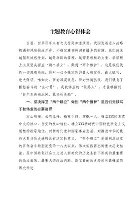 主题教育心得体会当前,世界百年未有之大变局加速演进,我国发展进入战略机遇和风险挑战并存、不确定难预料因素增多的时期。我们越来越强烈地感受到,越是壮阔的征程,越需要领航的力量,新征程上必须坚决捍卫两个确立,做到两个维护,这是我们战胜一切艰难险阻、应对一切不确定性的最大确定性、最大底气、最大保证。唯如此,面对风高浪急,面对惊涛骇浪,我们就有了团结奋斗的主心骨、成就伟业的领路人,才能够做到任尔东西南北风、稳坐钓鱼船。一、坚决捍卫两个确立做到两个维护是我们党续写千秋伟业的必要选择万山磅礴,必有主峰,船重千钧,掌舵一人。确立XXX同志党中央的核心、全党的核心地位,确立XXX新时代中国特色社会主义思想的指导地位,对新时代党和国家事业发展、对推进中华民族伟大复兴历史进程具有决定性意义。两个确立是深刻总结党的百年奋斗特别是党的十八大以来,伟大实践得出的重大历史结论,是中国特色社会主义进入新时代的历史条件下形成的最重要的政治成果,最重大的政治判断,最宝贵的历史经验和最确凿的历史结论。二、坚决捍卫两个确立做到两个维护是我们党永葆青春活力的根本保障坚强的领导核心和科学的理论指导,是关乎党和国家前途命运,党和人民事业成败的根本性问题,党和国家事业取得历史性成就,发生历史性变革,根本在于有XXXXXX作为党中央的核心,全党的核心掌舵领航,根本在于有XXX新时代中国特色社会主义思想科学引领。深刻领悟两个确立有了思想高度认同,才有政治绝对忠诚,行动坚决拥护。事实证明坚持两个确立,全党就有定盘星,全国人民就有主心骨,党和国家事业就能坚持正确前进方向。新征程上,我们必须深刻领悟两个确立的决定性意义,切实增强对两个确立的政治认同,思想认同、理论认同、情感认同,深刻理解XXX新时代中国特色社会主义思想的核心要义,精神实质,丰富内涵,实践要求,把这一思想贯彻落实到切实工作各方面全过程,朝着既定奋斗目标,勇毅前行。三、坚决捍卫两个确立做到两个维护是我们党实现民族复兴的使命要求坚决拥护两个确立。核心就是灵魂,就是力量,理论就是旗帜、就是方向。坚决拥护两个确立是具体的而不是抽象的,新征程上,要始终坚持以XXX新时代中国特色社会主义思想武装头脑,指导实践不断锤炼对党绝对忠诚的政治品格,不断增强政治意识,大局意识,核心意识,看齐意识,切实提高政治判断力,政治领悟力,政治执行力,坚决忠诚核心,拥戴核心,维护核心,捍卫核心,自觉做XXX新时代中国特色社会主义思想的坚定信仰者,忠实践行者,以咬定青山不放松的执着为全面建成社会主义现代化强国,实现第二个百年奋斗目标,以中国式现代化全面推进中华民族伟大复兴不懈奋斗。四、坚决捍卫两个确立,做到两个维护,是我们党员干部的最高政治原则和根本政治责任我们要把坚定维护两个确立,坚决做到两个维护作为最高政治原则和根本政治责任,更加自觉的维护XXX同志党中央的核心,全党的核心地位。更加自觉地维护以XXX同志为核心的党中央权威和集中统一领导,全面贯彻XXX新时代中国特色社会主义思想,坚定不移地在思想上政治上行动上同以XXX同志为核心的党中央保持高度一致。要把坚定拥护两个确立,坚决做到两个维护转化为精准发力,破解难题的主动作为,转化为履职尽责,开拓创新的担当奉献。转化为攻坚克难,真抓实干的实际行动,真抓实干,久久为功。在今后的工作生活中要做到以下3点。一是是以高度政治自觉培育忠诚之心。深刻理解两个确立意义,坚决做到两个维护。对党绝对忠诚,将讲政治放在首位,不断增强政治判断力、政治领悟力、政治执行力。始终做到向XXXXXX看齐、向党中央看齐、向党的理论和路线方针政策看齐,向党中央决策部署看齐,时刻在思想上政治上行动上同以XXX同志为核心的党中央保持高度一致。二是以高度思想自觉夯实理论之基。要把深入学习贯彻XXX新时代中国特色社会主义思想作为基本功,努力掌握党的创新理论的重大意义、丰富内涵、精髓要义和实践要求,力求做到全面系统学、及时跟进学、深入思考学、联系实际学,常学常悟、常悟常新。将学习教育作为终身必修课,以实际行动奋进新征程建功新时代。三是以高度行动自觉树立为民之志。将理论学习成果转化为履职担当的实际行动,始终认清我是谁、为了谁、依靠谁的问题,在推动XX十四五规划落地实施和全面深化土地权改革等工作中,胸怀两个大局,心怀国之大者,牢记三个务必,重实干、见行动,以钉钉子精神抓落实,用结果来作答,以实绩来交卷,确保圆满完成年度各项目标任务。