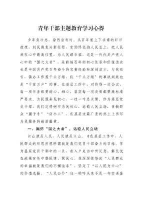 青年干部主题教育学习心得少年负壮志,奋烈自有时。从百年前上下求索的日日夜夜,到民族复兴新征程,党始终坚持人民至上,把人民放在心中最高位置,为人民谋幸福,这是一代代共产党人心中的国之大者,是跨越百年的初心传承和价值追求也是中国共产党百年奋斗的宝贵经验和深刻启示。与我而言,镇办工作虽千头万绪,但千头万绪的事说到底也是千家万户的事。在基层工作中,对待每一次会议、每一项任务都要耐心、细心,落实每一项决策都要高标准严要求。为民服务见初心,一枝一叶总关情。作为基层党员干部,我们定将树牢为民初心,站稳人民立场,甘做群众孺子牛店小二,在基层这篇广袤的热土上书写为民服务的崭新篇章。一、胸怀国之大者,站稳人民立场江山就是人民,人民就是江山。《在基层工作中,人民群众的所思所想所需就是我们党员干部奋斗的目标。作为基层党员干部中的一员,在入户走访中听民意、解民忧在政策宣传中察民情、聚民心,我深深体悟到人民群众的幸福就是我们的不懈追求,坚定了以人民为中心的价值选择。人民公仆这一称呼从来不是一句空话套话,只有在思想上尊重群众,政治上代表群众,感情上贴近群众,行动上深入群众,才能真正悟透不忘初心,方得始终的深刻含义。二、涵养学习之心,锤炼过硬本领坚硬优质的钢条,是经过千锤百炼而成的。踏上全面建设社会主义现代化国家新征程,使命光荣而艰巨,更需以咬定青山不放松的执着,奋力实现既定目标,以行百里者半九十的清醒不懈推进复兴伟业。基层党员干部正处于长本事、长才干的大好时期,学且学以致用是其在基层成长中的一大重要篇章。要涵养学习之心,在实践中锤炼过硬本领,不断提高解决实际问题的能力水平一要勤学善思。要意识到基层是一本包罗万象的大书,要如饥似渴地从中获取知识,助力成长。要学习业务知识,把工作做实做细做精;学习前辈工作经验,从老办法中激活新思路;学习与群众沟通,拉近与群众的距离;学习理论知识,从中汲取智慧和营养。同时要善于思考,杜绝忙忙碌碌、机械做事,从纷繁工作中总结规律,不断提高认识和工作水平。二要善于实践。刀要在石上磨,人要在事上练。要善于将自己所学应用到工作中去,在干中学,在学中干,切实提升工作实效。同时要应用到群众关心的实事中去,使自己成长为可堪大用、能担重任的栋梁之材。三、提高政治站位,发扬务实作风加强作风建设,是党践行初心使命、保持同人民群众血肉联系的关键之举;完成能力提升,是实现经济社会高质量发展的切题之要。在基层工作中,要勇于担当,勤于思考,不当会议文件的搬运工,不当表面用功的两面派,树立奋斗精神焕发昂扬斗志,做兢兢业业的实干家。一要牢牢树立严真细实快工作作风。认真践行一线工作法,坚决摒弃庸懒散慢拖瞒作风顽疾,以过硬作风保证各项任务目标顺利完成。二要增强干事创业的巧劲。关注党中央在关心什么、强调什么,加强理论和专业技能的学习,从大处着眼,自觉把局部融入大局,用整体性思维和系统方法对国之大者深耕细作。三要增强攻坚克难的韧劲。越是在爬坡过坎、滚石上山、转型升级的关键时期,越要有初心不改的执著、义无反顾的担当,不能一遇到困难就打退堂鼓,一碰挫折就意志消沉,要坚定理想信念,在坚韧不拔、千锤百炼中收获成功喜悦。过去一百年,党向人民、向历史交出了一份优异的答卷,现在,党团结带领中国人民又踏上了实现第二个百年奋斗目标新的赶考之路。我们要以一以贯之的炽热初心、一往无前的奋斗姿态,在工作中锤炼本领、展现作为,书写人民满意的时代答卷。