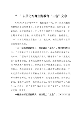 一以贯之写好主题教育三色文章XXXXXX在多地调研时,就抓好第一批、第二批主题教育衔接联动提出明确要求,各地要坚持科学谋划、统筹安排、分类指导,确保取得实效。广大党员干部要充分借鉴运用第一批主题教育成功经验,抓实理论学习、调查研究、检视整改,一以贯之写好主题教育三色文章,确保主题教育取得实实在在的成效。一心一意抓实理论学习,擦亮政治底色。XXXXXX指出,中国共产党人依靠学习走到今天,也必然要依靠学习走向未来。理论学习无疑是共产党人强基固本和充电赋能的重要途径。要确保主题教育见实效,就要聚焦主题主线,把学思想摆在首位,在学深悟透中提高理论素养、坚定理想信念,不断以学铸魂,打牢第二批主题教育的理论基础。广大党员干部要以此次主题教育为契机,抓实党的创新理论学习,原汁原味学原文,逐字逐句悟精神,在思想上补钙、在政治上加油、在能力上充电、在行动上加压,切实推动理论学习入脑入心,用理论上的清醒推动政治上的坚定,矢志不渝听党话、跟党走。一往无前抓实调查研究,锤炼能力成色。XXXXXX指出,调查研究是谋事之基、成事之道。调查研究是我们党的传家宝。第二批主题教育面对群众更直接,需要解决的问题更具体。要确保主题教育见实效,就不能走设计好的路,不能看编排好的戏,不能吃别人嚼过的馍,而是要真正把脚步迈向基层,把目光对准群众,将调查研究沉到一线、深入一线,扎实开展调查研究。广大党员干部要把调查研究作为基本功和看家本领练好,要坚持脚步向下,带着问题去发现问题,带着方法去解决问题,以蹲下身子看蚂蚁的心态深入基层,多去田间地头察实情、去村落院坝话家常、去墙根炕头问情况,以双脚沾泥看到第一眼真实,真正做到调以务实、研以致用。一如既往抓实检视整改,永葆初心本色。XXXXXX强调,坚持边学习、边对照、边检视、边整改,把问题整改贯穿主题教育始终,让人民群众切实感受到解决问题的实际成效。要确保主题教育见实效,就不能只是走走过场、做做样子,而是要看病问诊、对症下药,每一个检视出来的问题,都可能是积弊顽症;每一个征求的意见,都可能是治病良方。广大党员干部要结合主题教育把自己摆进去、把职责摆进去、把工作摆进去,勤掸思想尘、多思贪欲害、常破心中贼,坚持躬身自省,自觉刀刃向内,要拿出自剜腐肉的狠劲,在改字上下真功夫、见真章,切切实实除病灶祛顽疾,确保检视整改见行见效,切实把主题教育成果转化为推动工作的强大动力。