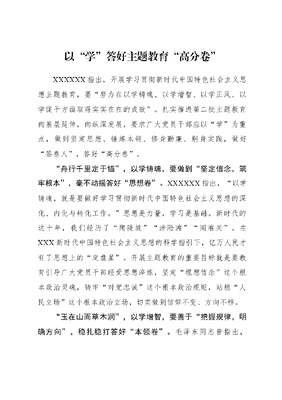 以学答好主题教育高分卷XXXXXX指出,开展学习贯彻新时代中国特色社会主义思想主题教育,要努力在以学铸魂、以学增智、以学正风、以学促干方面取得实实在在的成效。扎实推进第二批主题教育向基层延伸,向纵深发展,要求广大党员干部应以学为重点,做到坚定思想、锤炼本领、修身勤廉、躬身实践,做好答卷人,答好高分卷。舟行千里定于锚,以学铸魂,要做到坚定信念,筑牢根本,毫不动摇答好思想卷。XXXXXX指出,以学铸魂,就是要做好学习贯彻新时代中国特色社会主义思想的深化、内化与转化工作。思想是力量,学习是基础。新时代的这十年,我们经历了爬陡坡涉险滩闯难关,在XXX新时代中国特色社会主义思想的科学指引下,亿万人民才有了思想上的定盘星。开展主题教育的重要目标就是要教育引导广大党员干部经受思想淬炼,坚定理想信念这个根本政治灵魂,铸牢对党忠诚这个根本政治规矩,站稳人民立场这个根本政治立场,切实做到信仰不变、方向不移。玉在山而草木润,以学增智,要善于把握规律,明确方向,稳扎稳打答好本领卷。毛泽东同志曾指出,我们队伍里边有一种恐慌,不是经济恐慌,也不是政治恐慌,而是本领恐慌。面对新时代的新趋势、新规律、新格局,党员干部队伍中依然存在着本领恐慌的焦虑。以学增智为克服本领恐慌指明了方向,要求悟规律、明方向、学方法、增智慧,学看家本领、兴党本领、强国本领。这激励广大党员干部要迎难而上、爬坡过坎,弥补知识弱项、补全能力短板、突破经验盲区,打好地基;把握规律趋势、明确方向导向、学习方式方法,盖好楼房,不断提高履职尽责能力,做到眼中有光、脚下有路、心中有底,稳扎稳打答好本领卷。欲下廉者先之身,以学正风,要坚持严于律己,求真务实,修身立节答好勤廉卷。通过集中教育推动全党以自我革命精神解决党风方面的突出问题,是一条重要的历史经验。XXXXXX今年6月在内蒙古考察时就以学正风提出要求,强调大兴务实之风弘扬清廉之风养成俭朴之风。开展主题教育要推动全面从严治党向纵深发展,引导党员干部坚持求真务实的工作作风,扑下身子干实事、谋实招、求实效。突出问题导向,坚持边学习、边对照、边检视、边整改,为党员干部上好廉洁课,开展政治体检,清扫政治灰尘,筑牢贯彻落实中央八项规定精神的堤坝,让节俭朴素、力戒奢靡成为新风尚。知之深则行愈达,以学促干,要秉承学以致用,知行合一,身体力行答好实践卷。为学之实,固在践履。XXXXXX的脚步纵横跨越中国版图,这一串串植根沃土的足迹便是党员干部们最好的引领和标杆。开展主题教育要与大兴调查研究之风结合起来,引导党员干部用好深、实、细、准、效五字诀,走进户间访民情,走进田间看长势,走进厂间看发展。只有坚持知行合一,感悟XXX新时代中国特色社会主义思想的真理力量与实践伟力,拿出闯的精神、创的劲头和干的作风,迈开步子大胆为、甩开膀子尽力为,才能把党的创新理论运用到为人民服务中去,将主题教育成效转化为人民群众实实在在的获得感,转化为高质量发展的优异答卷。