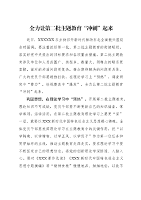 全力让第二批主题教育冲刺起来近日,XXXXXX在主持召开新时代推动东北全面振兴座谈会时强调,要注重抓好第一批、第二批主题教育的衔接联动,落实好党中央提出的目标要求和各项重点措施。第二批主题教育涉及单位和人员范围广、类型多、数量大,同群众的联系更直接,面对的矛盾问题更复杂,群众期待解决的问题更具体。广大的党员干部要趁热打铁,在理论学习上预热,调查研究中蓄力,检视整改中爆发,全力让第二批主题教育冲刺起来。巩固思想,在理论学习中预热。开展第二批主题教育,理论知识不可或缺,党员干部要不断更新自己的知识储备,常学常用,活学活用,在第二批主题教育理论学习上要更深一层,就要以XXX新时代中国特色社会主义思想凝心铸魂。全体党员干部要发挥理论学习在主题教育中的关键作用,把以学铸魂、以学增智、以学正风、以学促干作为第一位任务和贯穿始终的主线,推动主题教育走深走实。要在理论学习中要不断坚定自己的理想信念,将党的创新理论学深悟透、入脑入心。要对《XXX著作选读》《XXX新时代中国特色社会主义思想专题摘编》等精神食粮慢慢地品、细细地尝,以此不断增强四个意识、坚定四个自信、做到两个维护,筑牢信仰之基、补足精神之钙、把稳思想之舵。脚粘泥土,在调查研究中蓄力。第二批主题教育重点在基层,关键在基层,主题教育开展得好不好,归根到底要看为基层群众解决实际问题、推进整改落实的成效怎么样。调查研究就是这样的一个法宝,可以从人民群众的切身利益出发,深入实际、深入群众,真正带着问题亲力亲为,做到既看高楼大厦又看背阴胡同。要不断探底,弄实弄清最基础的数据,找寻到最直接的矛盾,直面最艰难的问题,再有的放矢地提出对策,既要解决迫在眉睫的急难愁盼,也需要考量长久防止问题复发。在此过程中,需要用求真务实的行动,以蹲点调研解剖麻雀的方式和一竿子插到底的精神开展调查研究,并持续推动成功做法经验,让调研成果更好更便捷地服务群众。锐意进取,在检视整改中爆发。俗话说:见人之过易,见己之过难。第二批主题教育最关键一招便是检视整改,那改什么,怎么改尤为重要,党员干部要在调查研究之后积极作为,直面难点、堵点问题,不遮遮掩掩,不推诿扯皮,敢于直面工作中的问题与挑战,要有承担责任的魄力、迎难而上的勇气,以抓铁有痕、踏石留印的担当精神和敢拼敢闯的实际行动诠释此次主题教育的成果担当。要向领导请教,向同事学习,对发现的问题要有具体的整改落实措施和方向,对查摆的问题要不断进行纠治,立行立改;对群众反应强烈的急难愁盼要明确清单,列出整改措施,对标对表,一项项抓落实,对账销号。要坚持把当下改与长久立结合起来,建立回访机制,定期对调研对象和整改成效等事项进行回头看,确保检视整改见行见效。