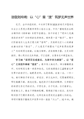 致敬刘玲琍:以心普度筑梦无声世界近日,由中央组织部、中央学习贯彻XXX新时代中国特色社会主义思想主题教育领导小组办公室、中央广播电视总台联合制作的《榜样8》专题节目播出,其中讲述了党和人民满意的好老师刘玲琍的先进事迹。榜样是一面镜子,镜中闪烁着追求人生真正意义的密码,反射的光芒入心刻画着向善向好的路径。广大党员干部要向无声世界的筑梦人刘玲琍同志致敬,以她为榜样,汲取榜样力量,立足本职岗位,用心用力在无私奉献、守正创新、永葆本色中彰显有为。学习她采得百花成蜜后,为谁辛苦为谁甜,以爱心之浓提升奉献温度。教书育人烛光尽,师为楷模根基牢。刘玲琍同志像一束柔和烛光,无私地燃烧自己温暖着无声世界中的孩子们。她既是老师,也是妈妈,日复一日,一字一句,教听障孩子学发音、学说话、学文化知识,还要兼顾喂饭、帮忙佩戴耳蜗、换洗衣服。她把孩子们渴求的眼神、父母殷切的希望化作无尽的动力,不畏吃苦、乐于吃苦,白天教学生,回家教儿子,像永不停歇的陀螺。帮助孩子张口说话,是刘玲琍对孩子们最朴素的爱,这种无私关爱迸发出温暖人间的光,带领听障孩子翻越无声世界中的一座座大山。32年来,她帮助20余名听障学生考上大学,80多名孩子回归社会顺利就业。大音希声,大爱无言是对刘玲琍同志最好的诠释。广大党员干部要以刘玲琍同志为榜样,拿稳爱的接力棒,激发无私奉献的原动力,涵养乐于吃苦的品格,在平凡的岗位上充分发光发热,勇于奉献自我,把先进性体现在实际行动中,敢于作为、善于作为,在担苦、担难中增锐气,在办事、扛事中当先锋,在苦干、实干中挥汗水,于忘我工作中不断谱写新篇章。学习她路漫漫其修远兮,吾将上下而求索,以钻心之强提升克难深度。对于刘玲琍同志而言,困难好似成功的磨刀石,她秉持一颗强有力的钻心,于守正中抓住创新这个牛鼻子,攻克了生活中、教学中的难题。她的儿子8个月被确诊先天性神经性耳聋,她伤心却没有气馁,而是翻阅大量资料,几乎是重新开始学习一门学科,坚持每天对儿子进行训练,后来孩子终能开口说话。不仅如此,她还将用到自己儿子身上的训练方式与专业课学习、教学实践有机结合,在教学中,为帮助听障学生发准音,反复把嘴唇贴近孩子的手背,让孩子们感受气流大小与声带振动,甚至把学生的手指伸进她的嘴里,感受舌根音舌头的变化,她不断总结经验,探索出情景教学合作学习等教学模式,自编唇舌操和语训教材,撰写了《聋校语文教学应做好三个转变》等20多篇论文,丰富了我国听障教研库,为听障孩子语言康复训练作出巨大贡献。广大党员干部要向刘玲琍同志看齐,在本职岗位上不断地磨砺自己,做到敬业、乐业、勤业、精业,其间不断拓宽认知的广度和深度,努力丰富知识结构,开拓视野胸怀,加快推动认知迭代、理念升维、能力重构,育守正之心、练守正之能,工作中勤于思考,保持一颗钻研之心,遇到难题探索新思路、新方法,力争做到苟日新,日日新,又日新,用出彩的行动交出新时代有为答卷。学习她人生代代无穷已,江月年年只相似,以初心之坚提升本色纯度。初心是在平凡岗位上倾尽所能,坚守是一种大智若愚的智慧。刘玲琍同志在特殊教育岗位32年的坚守,全凭牢固的初心在支撑,初心是她入党前14岁时的思考怎样才能让听障孩子也像正常人一样读书学习,是入党后用我努力的工作,为残疾孩子谋幸福。多年来,尽管条件有限,她仍然拒绝康复机构抛给她的橄榄枝,默默坚持在学校教书育人,并资助4名贫困残疾学生完成学业。虽然每周要上20多节课,忙得像陀螺,但她依然坚持到社区里为那些不能到学校接受教育的重度残疾孩子送课上门。靡不有初,鲜克有终。广大党员干部要向刘玲琍同志学习,坚守初心使命,在慎始慎终中恪守准则,保持本真,在工作岗位上自觉淬炼政治本色,默默无闻干事创业,做到心不动于微利之诱,目不眩于五色之惑,拿出一竿子插到底的劲头,将各项工作做实做细做出彩;要始终把为人民谋幸福作为初心,提升为民服务本色纯度,以民声为向干事创业,做到勤上群众的门、见群众的面、听群众的声,在平凡的岗位上始终如一、担当作为,用直抵民心的有为成绩,将我们党的初心擦拭得无比耀眼。