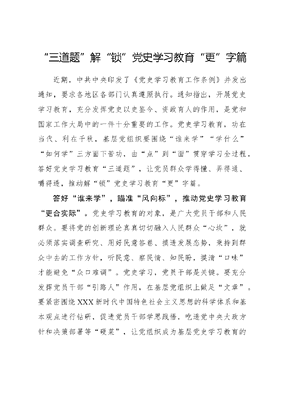 三道题解锁党史学习教育更字篇近期,中共中央印发了《党史学习教育工作条例》并发出通知,要求各地区各部门认真遵照执行。通知指出,开展党史学习教育,充分发挥党史以史鉴今、资政育人的作用,是党和国家工作大局中的一件十分重要的工作。党史学习教育,功在当代、利在千秋,基层党组织要围绕谁来学学什么如何学三方面下苦功,由点到面贯穿学习全过程,答好党史学习教育三道题,让党员群众学得懂、弄得通、嚼得透,推动解锁党史学习教育更字篇。答好谁来学,瞄准风向标,推动党史学习教育更合实际。党史学习教育的对象,是广大党员干部和人民群众。要将党的创新理论真真切切融入人民群众心坎,就必须落实调查研究、用好民意答卷、摸透发展态势,秉持到群众中去的工作方针,听民意、察民情、知民盼,摸清口味才能避免众口难调。党史学习,党员干部是关键。要充分发挥党员干部引路人作用,在基层党组织上做足文章。要紧密围绕XXX新时代中国特色社会主义思想的科学体系和基本观点进行钻研,促进党员干部学思践悟,吃透党中央大政方针和决策部署等硬菜,让党组织成为基层党史学习教育的桥头堡和先锋队。也要学会量体裁衣,讲深讲透群众喜闻乐见的家常菜,真正把党的好方针、好政策传播开,让人民群众在党员干部带动下,自发参与,以点到面逐步构建基层党史学习教育的战斗堡垒。答好学什么,靶向新浪潮,推动党史学习教育更有底气。当前,世界正逢百年未有之大变局,国际形势风云变幻,党史学习教育也必须与时俱进,符合高要求、明确严基调、落实真举措。百年党史蕴藏着革命先驱的集体智慧,是取之不尽的源头活水。党员群众要耐下心、沉住气,细嚼慢咽,充分感悟革命先烈的崇高信仰和无私付出,怀揣一颗后来者的赤子心,重温光荣传统、传承优良作风、手握三大法宝,争做赶考人、答好时代卷、拿稳接力棒,温故知新、常学常新。以史为鉴,精读、细读、深读党史,掌握时代脉络、厘清发展规律、塑强政治觉悟,面对复杂形势、繁重使命、艰巨任务,开眼界、负重担、增本领,贯彻长风破浪会有时,直挂云帆济沧海的斗志,攻坚克难、直击痛点、突破短板,才能夯实风雨不动安如山的底气,成为堪当民族复兴重任的中流砥柱。 答好如何学,填充记事本,推动党史学习教育更有成效。基层党员群众文化程度参差不齐,学习能力和文可居文库——海量学习资料,手机电脑均可下载www.wenkeju.com理解水平也存在差异。若教育只顾念文件、喊口号,学习内容千篇一律,讲学方式大水漫灌,全然不顾底下学员,党史学习效果必然事倍功半。基层党组织要把握受众群体、创新教学方式、扩大教育范围,采用互动式等多元化教学方式,对不同领域、不同行业、不同层级的党员群众开展分流化的教育。要接地气、讲实际,深入田间地头、学校社区、文娱广场,开展多样化宣讲,采取吹拉弹唱、线上直播、院坝会等群众喜闻乐道的方式,并可以通过邀请老革命、老干部现身说法,把乏味的书面语转变为生动的贴心话,实现以干部身边事教育群众身边人,激发党员群众的积极性,变被动接受教育为主动参与学习,推动党史学习遍地开花。文可居文库——海量学习资料,手机电脑均可下载www.wenkeju.com