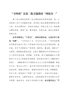 下四功让第二批主题教育四度合一第二批主题教育是第一批主题教育的连贯和承继,是一个逐渐深入和扩大范围的过程。推动第二批主题教育要紧扣主题主线、突出问题导向、坚持标本兼治、聚焦主责主业,持续增加理论深度、调研广度、整改精度、发展力度,推动主题教育落地见效。在学深悟透上下苦功,聚焦主题主线,让理论学习更有深度。非学无以广才,非志无以成学。党的创新理论思想指引着共产党人不断推进中国式现代化取得新进展、新突破,党员干部要紧扣学思想、强党性、重实践、建新功总要求,持续强化理论武装,自觉从XXX新时代中国特色社会主义思想中找答案、明思路、定举措。学习XXXXXX在主题教育工作会议上的重要讲话精神,组织读书班学习《XXX著作选读》、《XXX新时代中国特色社会主义思想专题摘编》等指定书目,通过自主学习、集中研讨等形式把理论学习融入日常、抓在经常。要融会贯通学,掌握科学的学习节奏,细嚼慢咽、有条不紊,做到拨开迷雾现真章,见树木更见森林。要联系实际学,注重学用结合,自觉把理论学习成果转化为坚定理想、锤炼党性、推动工作的强大力量。在全面系统上下细功,聚焦问题导向,让调查研究更有广度。全面系统的调研才能掌握到全面系统的情况,从而增强决策的可操作性和推广性。因此,调研覆盖要有广度,少走规定路线、少指定范围,多些自选动作、多采用四不两直、蹲点调研等方式,对象上要深入基层、深入群众、深入生产生活实践,真正听到群众赞扬话、批评语等真心话,确保准确、全面、深透地了解民情、解决问题。方式上要坚持一切从实际出发,既下足面上的功夫,更要有重点了解点上的情况,到工作开展好的示范点去收集总结经验,到困难较多、情况复杂、矛盾集中的地方去收集问题,综合运用蹲点调研、督查调研、典型调研、走访调研、跟踪调研等调查方法,从调研中了解鲜活案例和调查对象的现实困境、发展需求。在动真碰硬上下硬功,聚焦标本兼治,让检视整改更有精度。一条主线贯始终。坚持边学习、边对照、边检视、边整改,把问题整改贯穿主题教育始终,奔着问题去、盯着问题查、追着问题改,以刀刃向内的自我革命精神,动真碰硬解决实际问题。要全面体检查问题,系统梳理调查研究发现、推动发展遇到的问题,结合巡视巡察、审计监督发现的问题,认真开展自我检视,深入查摆突出问题,形成主题教育问题清单。要靶向治疗抓整改,针对检视查摆出来的问题,认真制定针对性整改措施,从政治、思想、能力、作风、纪律等方面深入进行党性分析,明确整改目标、整改时限、整改责任,务求管理闭环。在真抓实干上下实功,聚焦主责主业,让推动发展更有力度。聚焦主责主业,有针对性地学习掌握做好实际工作、履行岗位职责必备的知识。要坚持问题导向,善于发现问题、解决问题,聚焦制约经济发展的瓶颈和群众急难愁盼问题,研究提出具体可行的思路办法和政策举措,以实际成效检验主题教育成果。要力戒形式主义。要把严的要求、实的作风贯穿于主题教育全过程,把开展主题教育作为推动工作的重要契机,把开展主题教育和推动中心工作结合起来,真正把实现高质量发展过程中存在的问题找准、对策提实,不断用主题教育链接好学与干,激发党员干部职工攻坚克难、干事创业的强大动力,切实通过以学促干抓住时代机遇、应对困难挑战、赢得历史主动。