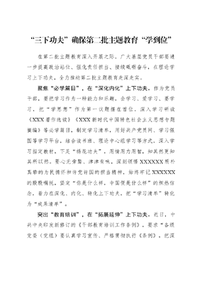 三下功夫确保第二批主题教育学到位在第二批主题教育深入开展之际,广大基层党员干部要进一步提高政治站位、强化责任担当、接续砥砺奋斗,在理论学习上下功夫,全力推动第二批主题教育走深走实。聚焦必学篇目,在深化内化上下功夫。作为党员干部,要把学习作为一种能力和乐趣,会学习、爱学习、要学习,把学思想作为第一议题摆在首位,深入学习研读《XXX著作选读》《XXX新时代中国特色社会主义思想专题摘编》等必学篇目,制定学习清单,用好共产党员网、学习强国等学习平台,结合读书班、理论中心组学习等方式,深入学习指定教材,下足绣花功夫,用情用力用智,知其然更知其所以然。要心无旁骛、津津有味,深刻领悟XXXXXX质朴真挚的为民情怀和许党许国的担当精神,始终牢记XXXXXX的殷殷嘱托,坚定你是什么样,中国便是什么样的炽热信念,着力在深化、内化、转化上下功夫,把学习清单转化为成果清单。突出教育培训,在拓展延伸上下功夫。近日,中共中央印发新修订的《干部教育培训工作条例》,要求各级党委(党组)要认真学习宣传、严格贯彻执行《条例》,把深入学习贯彻XXX新时代中国特色社会主义思想作为主题主线,高质量教育培训干部,高水平服务党和国家事业发展,为以中国式现代化全面推进中华民族伟大复兴提供思想政治保证和能力支撑。在主题教育理论学习过程中,各级党组织要按照《干部教育培训工作条例》要求,采取走出去、抓拓展的方式,组织党员干部到中国浦东干部学院、中国井冈山干部学院、中国延安干部学院等国家级干部教育培训机构深入开展学习XXX新时代中国特色社会主义思想主题教育,不断强化忠诚教育、革命传统教育,深刻领会以伟大建党精神为源头的中国共产党人精神谱系,进一步增强四个意识、坚定四个自信、做到两个维护,守好初心,担好使命,永葆共产党人政治本色。立足以学促干,在转化运用上下功夫。广大党员干部要匡正干的导向,增强干的动力,形成干的合力,把学习贯彻XXX新时代中国特色社会主义思想与促进改革发展有机结合起来,深刻把握XXX新时代中国特色社会主义思想的世界观和方法论,坚持学以致用、知行合一。以强化理论学习指导发展实践,以深化调查研究推动解决发展难题,把学习和调研贯穿到落实党的XX大部署的各项任务中去。提振抓的精神,拿出干的行动,创造实的业绩,破除各种思想障碍和束缚,增强改革创新的意识和勇气,把广大群众的智慧和力量凝聚到产业发展、乡村振兴、项目建设、绿色崛起、民生保障等重大工程、重点工作上来,用推动高质量发展的新成效检验主题教育成果。