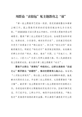 用群众表情包见主题教育之效第一批主题教育已经告一段落,要抓好继续整改和建章立制工作,把主题教育探索的好经验好做法转化为长效机制。XXXXXX近日在黑龙江考察时,对开展主题教育提出明确要求,强调第二批主题教育已经启动,各地要坚持科学谋划、统筹安排、分类指导,确保取得实效。各级基层党组织和党员干部要善于用群众脸色,努力把规定动作做实做好做到位,积极把特色动作做深做活做到家,有效解决好群众身边的难点、痛点、堵点问题,以忠诚之心、担当之心、工匠之心走好人民群众满意之路,用人民满意度检验主题教育成效,着力提升第二批主题教育成色。要善于从群众表情包中践初心,以群众满意的忠诚之心解开群众锁眉愁,推动主题教育入脑入心。俗话说:人识脸色草随风。群众脸上表现出来的期盼和渴望,就是解决问题的发力点。开启第二批主题教育,尤其需要接好接力棒,做好第一批主题教育和第二批主题教育的衔接联动工作,各级党组织要对主题教育的实效进行评估,坚持用事实说话、开门抓评估,让群众评价,确保评估的客观真实。群众脸色是情感和情绪的真实流露,群众满意不满意是评判主题教育成效的根本标准。党员干部要在善于看群众脸色中提升为人民谋幸福,为民族谋复兴的高度,认真贯彻落实以人民为中心的发展思想,坚持脚步为亲,放下架子、扑下身子、迈开步子,真正走进人民群众当中,深入搞好调查研究,从群众的脸色中判断他们高兴不高兴、满意不满意,让第一批主题教育真正地落地生花,确保环环相扣、丝丝入扣,让第二批主题教育起好步。要善于从群众表情包中办实事,以群众满意的担当之心抚平群众撇嘴怨,推动主题教育走深走实。天下之德,莫过于忠。开展第二批主题教育,第一步非常关键,要把准学思想、强党性、重实践、建新功主题教育总要求,坚持主题不变、标准不降、力度不减,努力在以学铸魂、以学增智、以学正风、以学促干方面取得实实在在的成效。持续推动理论学习,在学深悟透中牢记初心使命;大兴调查研究之风,躬身力行解决群众实际问题,从群众的脸色中把准主题教育的风向标,有序推进第二批主题教育。群众脸色能够折射出党员干部履行职责的优劣和好坏。党员干部要在善于看群众脸色中真正把人民放在心中最高位置,牢固树立群众利益无小事、民生工作无小事思想,盯住群众最盼、最急、最忧、最怨的民生领域问题,持续不断地在思想上紧螺丝,持之以恒地在整改上下猛药,始终保持准、狠、韧的劲头,让主题教育的开展精准对接基层发展的需求和人民群众的需求。要善于从群众表情包中知警惕,以群众满意的工匠之心绽放群众咧嘴笑,推动主题教育见行见效。群众脸色能够衡量出党员干部担当作为的分量,党员干部工作干得好不好,群众最有发言权,群众的口碑是检验党员干部工作的试金石。推动第二批主题教育,关键在人民群众满意,这就需要通过群众脸色来检验主题教育效果,对群众不满意的地方及时整改,对群众满意的地方持续保持。要坚持问题导向、群众导向,站稳人民立场,努力做到民有所呼、我有所应,把主题教育良好成效转化为推动工作强大动力,不断提升人民群众的获得感、安全感、幸福感。群众是否满意取决于党员干部对自身问题整改力度和所作所为是否真正让群众得到实惠。党员干部要在善于看群众脸色中自觉砥砺斗争精神,对标对表群众的期盼,强化自我革命和担当作为的厚度,努力把群众工作做细做深做活,推动主题教育往深里走、往心里走、往实里走,用为民服务的温度提升群众满意度。