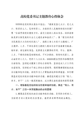 高校党委书记主题教育心得体会XXXXXX在党的XX大报告中指出:教育是国之大计、党之大计。培养什么人、怎样培养人、为谁培养人是教育的根本问题要全面贯彻党的教育方针,落实立德树人根本任务,培养德智体美劳全面发展的社会主义建设者和接班人,要着力培养担当民族复兴大任的时代新人。高校立身之本在于立德树人,广大教师、人才、干部在落实立德树人根本任务中扮演着实践者、组织者、谋划者的角色,发挥着至关重要的作用。学生、教师、人才、干部的培育是相辅相成、不可分割的,培育时代新人,务必涵育育人之人。党的十八大以来,XXXXXX提出坚持和加强党的全面领导、坚持党对教育工作的全面领导、坚持党对人才工作的全面领导、坚持党对干部工作的全面领导,强调要增强党组织政治功能和组织功能。高校作为人才聚集高地和培养摇篮,如何增强基层党组织政治功能和组织功能,推进党的建设引领育人、育才、育干三位一体深度融合,成为摆在高校面前的重要课题一、增强基层党组织政治功能和组织功能,推进育人、育才、育干三位一体深度融合的必然逻辑1.增强基层党组织政治功能和组织功能,是坚持为党育人、为国育才初心使命的内在要求。教育具有鲜明的政治属性。XXXXXX在中共中央政治局第五次集体学习时强调,我们要建设的教育强国,是中国特色社会主义教育强国。中国特色社会主义教育强国要培养的是一代又一代拥护中国共产党领导和我国社会主义制度、立志为中国特色社会主义奋斗终身的人才。坚持党的全面领导,是办好人民满意的教育、培养德智体美劳全面发展的社会主义建设者和接班人必须牢牢把握的根本属性。因此,建设中国特色社会主义教育强国,必须以XXX新时代中国特色社会主义思想为指导,把党对教育事业的全面领导贯彻好、落实好。党的力量来自组织。党的全面领导、党的全部工作要靠党的坚强组织体系去实现。政治功能是党组织的基本功能,组织功能服务于政治功能,是发挥党组织政治功能的基础和保证,两者相辅相成、内在统一。高校只有切实增强党组织的政治功能和组织功能,才能充分发挥党的政治优势、组织优势,才能确保立德树人根本任务的落实。2.推进育人、育才、育干三位一体深度融合,是确保党的事业后继有人的迫切需要。育才造士,为国之本。XXXXXX指出实现中华民族伟大复兴,坚持和发展中国特色社会主义,关键在党,关键在人,归根到底在培养造就一代又一代可靠接班人。这是党和国家事业发展的百年大计。当前,党和国家对高等教育、科学知识和优秀人才的需求十分迫切,而高校是培养人才的主要基地、汇聚人才的战略高地,广大教师、人才是全面贯彻党的教育方针、落实立德树人根本任务的主要力量,广大干部是推动高校满足党和国家事业发展对优秀人才需要的谋划者、推动者因此,高校必须坚持、加强党的领导,坚持全员全过程全方位育人大格局,推进育人、育才、育干三位一体深度融合,涵育学生为学、为事、为人示范的大先生,建设一支矢志爱国奉献、勇于创新创造的优秀人才队伍和高素质专业化的干部队伍,为培育堪当民族复兴大任的时代新人提供坚强的组织保证,确保中国特色社会主义事业后继有人、代代相传。二、增强基层党组织政治功能和组织功能,推进育人、育才、育干三位一体深度融合的价值意蕴1.增强基层党组织政治功能和组织功能,推进育人、育才育干三位一体深度融合,是对培养什么人、怎样培养人、为谁培养人的时代回答。增强党组织政治功能和组织功能,是马克思主义建党学说揭示的科学真理,是中国共产党百余年奋斗的制胜秘诀。百余年实践证明,充分发挥党组织政治功能和组织功能,能助推党的事业不断从胜利走向胜利。党的十八大以来,我国教育事业发展取得显著成就的重要原因就是有力贯彻和全面加强了党对教育事业的全面领导。当前,全球风云变幻,我国发展面临新的战略机遇、战略任务、战略阶段、战略要求、战略环境在此背景下,人才是实现民族振兴、赢得国际竞争主动的战略资源,世界各国综合国力的竞争,归根结底是人才竞争,人才是衡量一个国家综合国力的重要指标。为党育人、为国育才,成为百年未有之大变局下实现中华民族伟大复兴和第二个百年奋斗目标的关键所在。因此,只有坚守组织严密这个党的光荣传统,充分发挥党的组织优势,培养骨干、集聚人才,才能顺应立德树人的时代诉求,把准人才培养的内在要求,面向青年学生回答好中国之问、世界之问、人民之问、时代之问,引领青年学生担好天将降大任于斯人的使命重任。2.增强基层党组织政治功能和组织功能,推进育人、育才育干三位一体深度融合,是对培养什么人、怎样培养人、为谁培养人的优化解法。国势之强由于人,人才之成出于学一流的人才培养必须紧紧围绕和依靠一流的师资力量、一流的科技领军人才和一流的教育管理队伍。高校必须发挥党的领导核心作用,发挥在高质量人才培养、高层次人才聚集、高素质干部选育