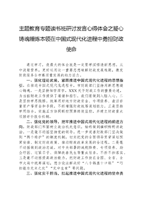 主题教育专题读书班研讨发言心得体会之凝心铸魂锤炼本领在中国式现代化进程中勇担财政使命通过学习,我最大的体会就是一定要学深悟透新思想,从中汲取营养,更好运用这一重要思想破解财政发展难题,激发财政服务全市高质量发展的动力活力。一、强化理论武装,紧跟推进中国式现代化进程的思想指引。在推进中国式现代化进程中,市财政部门坚持用新思想凝心铸魂。一是坚持细学深学。XXX关于财政工作的重要论述,为当前财政工作提供了遵循和指引,我们要做到入脑入心。二是坚持学思践悟。统筹用好地方财政资金、专项债券、盘活存量资产等资金和手段,不断增强财政统筹谋划能力。三是坚持学用结合。实施五方协同联控预算绩效监控,并建立财政重点项目评价报告机制。二、强化党的领导,把牢推进中国式现代化进程的前进方向。财政部门牢固树立政治机关意识,始终做到旗帜鲜明讲政治。一是毫不动摇坚持党的领导。进一步完善财政部门坚决做到两个维护的制度机制,切实把党的全面领导贯穿谋划预算安排、制定财政政策、推动财政改革发展的全过程。二是毫不动摇做到政治忠诚。对中央部署的减税降费、专项债券、助企纾困、过紧日子、保障改善民生等重点任务,不折不扣落实。三是毫不动摇提高政治能力。把财政工作放在全国、全省、全市大局中统筹谋划,想方设法解决好八个锅盖十口锅巧妇能为无米之炊无中生有等问题。三、强化实干担当,扛起推进中国式现代化进程的使命责任。财政是国家治理的基础和重要支柱。一是保持财政平稳运行。下一步,将加强财源建设,强化重点税源跟踪分析,完善重点行业税收管控。大力压减市直预算单位公用经费和一般性支出。坚持积极财政政策加力提效,支持扩大内需、助企纾困和经济内生增长。二是坚持财政守正创新。大力推进财政资金股权投资改革。深化与政策性银行合作。推动存量资产盘活。积极推动一钱多用。三是守牢财政风险底线。支持区县保三保,增强基层三保能力。加强债务风险监测和预警。加大财政民生投入保障力度。四、强化队伍建设,构筑推进中国式现代化进程的坚强堡垒。财政部门着力打造忠诚干净担当的高素质财政干部人才队伍。一是提升财政干部专业化水平。不断提升前瞻预判能力、实战实操能力、有效落实能力,吃透上级政策精神。二是筑牢财政干部廉政防线。加大对重点事项、关键岗位、关键环节财政运行的制约和监督。三是改进财政干部工作作风。全面落实严真细实快作风,坚决做到不搞花架子、不打糊涂仗、不当太平官。打造铁算盘、铁账本、铁规章三铁队伍,为加快建设强新优富美高新时代社会主义现代化强省会保驾护航。