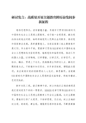 研讨发言:高质量开展主题教育踔厉奋发阔步新征程感悟思想伟力,汲取智慧力量。开展学习贯彻XXX新时代中国特色社会主义思想主题教育,对于统一全党思想、解决党内存在的突出问题、始终保持党同人民群众血肉联系、推动党和国家事业发展,具有重要意义。当前正值第二批主题教育开展之际,作为青年干部,要把学习贯彻XXX新时代中国特色社会主义思想转化为坚定理想、锤炼党性和指导实践、推动工作的强大力量,以学铸魂、以学增智、以学正风、以学促干,在结合、融合、贯通上下功夫,找准推进工作的切入点、解决问题的着力点,不断填补知识空白、补齐素质短板、增强能力弱项,真正做到对党的创新理论入心见行、善思善用,自觉做XXX新时代中国特色社会主义思想的坚定信仰者、积极传播者、忠实实践者。树牢为民三观,鼓足精神干劲。树立和践行正确政绩观是我们党对党员干部的一贯要求。XXXXXX在学习贯彻XXX新时代中国特色社会主义思想主题教育工作会议上强调,这次主题教育,要教育引导广大党员、干部学思想、见行动,树立正确的权力观、政绩观、事业观,增强责任感和使命感,不断提高推动高质量发展本领、服务群众本领、防范化解风险本领。XXXXXX在此次主题教育中对树立和践行正确三观作出重要论述,体现了对新时代党的建设和干部队伍建设规律的深邃思考和深刻把握,为匡正政绩观、强化宗旨意识、推动实干担当指明了前进方向、提供了根本遵循。要通过学习XXXXXX关于牢固树立和践行正确权力观、政绩观、事业观的重要论述,深刻认识政绩为谁而树、树什么样的政绩、靠什么树政绩的问题,进一步增强开展工作的决心和动力,把群众满意作为检验工作的重要标准,把群众批评作为改进工作的动力源泉,真正破解一批影响和制约生态环境保护工作高质量发展的堵点、难点、痛点,不断增强人民群众的获得感、幸福感、安全感。锤炼党性修养,铸牢政治忠诚。XXXXXX强调,在干部干好工作所需的各种能力中,政治能力是第一位的。回顾我们党历次党内集中教育,都把锤炼党员、干部政治能力作为重要目标、鲜明标尺。中国共产党人具有鲜明的政治品格,这是我们党历经百年而风华正茂、饱经磨难而生生不息的基因密码,是我们党的独特优势和力量之源。开展学习贯彻XXX新时代中国特色社会主义思想主题教育的目标任务之一,就是锤炼品格强化忠诚,我们要以此次主题教育为契机,牢牢把握学思想、强党性、重实践、建新功总要求,自觉用XXX新时代中国特色社会主义思想改造主观世界,深刻领会这一思想关于坚定理想信念、提升思想境界、加强党性锻炼等一系列要求,主动把自己的思想摆进去,做到内化于心、外化于行,始终保持共产党人的政治本色,始终在政治立场、政治方向、政治原则、政治道路上同党中央保持高度一致,始终坚定维护党中央权威和集中统一领导,坚决把对党忠诚体现到干好生态环境保护工作的实际行动上。勇于刀刃向内,紧盯问题整改。刀刃向内的自我革命精神是我们党长盛不衰的重要原因,是我们党最鲜明的品格。XXXXXX在学习贯彻XXX新时代中国特色社会主义思想主题教育工作会议上明确指出,要坚持边学习、边对照、边检视、边整改,把问题整改贯穿主题教育始终,让人民群众切实感受到解决问题的实际成效。问题是时代的声音,解决问题是最好的教育,敢于正视问题、善于发现问题、能够解决问题,既是对党员干部是否真学习、真整改的一次检验,也是确保主题教育取得实效的关键所在。主题教育开展得好不好,主要看检视问题、整改问题是否彻底、能否到位。因此,我们要充分认识检视整改在主题教育中的重要意义,切实增强抓好检视整改工作的政治自觉、思想自觉和行动自觉,敢于刀刃向内,打破条条框框,从政治、思想、能力、作风、纪律等方面进行党性分析,认真分析排查出的问题,找准问题症结,分清主次矛盾,提出解决问题的可行思路和具体举措,在发现问题、解决问题过程中练就过硬本领、增强履职能力。征程万里风正劲,重任千钧再出发。让我们更加紧密地团结在以XXX同志为核心的党中央周围,充分运用好第一批主题教育有效做法和成功经验,以更加饱满的政治热情、更加务实的工作作风,推动第一、二批主题教育有机衔接、紧密联动,努力做到善始善终、善作善成,把主题教育激发出来的信心、干劲和力量,转化为接续奋斗的强大动力,奋力谱写我市高质量发展新篇章。
