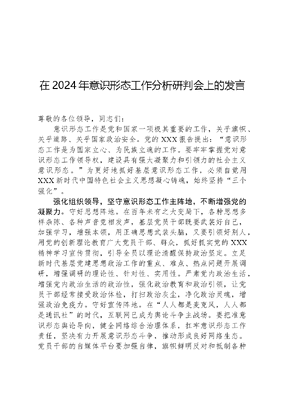 在2024年意识形态工作分析研判会上的发言尊敬的各位领导,同志们:意识形态工作是党和国家一项极其重要的工作,关乎旗帜、关乎道路、关乎国家政治安全。党的XXX报告提出:意识形态工作是为国家立心、为民族立魂的工作。要牢牢掌握党对意识形态工作领导权,建设具有强大凝聚力和引领力的社会主义意识形态。为更好地抓好基层意识形态工作,必须自觉用XXX新时代中国特色社会主义思想凝心铸魂,始终坚持三个强化。强化组织领导,坚守意识形态工作主阵地,不断增强党的凝聚力。守好思想阵地。在百年未有之大变局下,各种思想多样杂陈、各种声音竞相发声,基层党员干部既要武装好自己,加强学习,增强本领,用正确思想武装头脑,又要引领好别人,用党的创新理论教育广大党员干部、群众,抓好抓实党的XXX精神学习宣传贯彻,引导全员以理论清醒保持政治坚定。立足新时代基层党建思想政治工作的重点、难点、热点问题开展调研,增强调研的理论性、针对性、实用性。严肃党内政治生活,增强党内政治生活的政治性,强化政治教育和政治引领,让党员干部经常接受政治体检,打扫政治灰尘,净化政治灵魂,增强政治免疫力。守好宣传阵地。在人人都是麦克风,人人都是通讯社的时代,互联网已成为舆论斗争主战场。要把准意识形态舆论导向,健全网络综合治理体系,扛牢意识形态工作责任,坚决有力开展意识形态斗争,推动形成良好网络生态。党员干部的自媒体平台要加强自律,旗帜鲜明反对和抵制各种错误观点,理直气壮批驳各种错误言论。要实现党的意识形态在党员干部、职工群众生活中的鲜活表达,通过喜闻乐见的形式,嵌入党员干部、职工群众的生活环境、交流平台、认知系统中,让他们爱听爱看、产生共鸣。加强机关文化建设,开展生动活泼、健康向上的群众性基层文化活动,为党员干部提供高品质精神食粮。守好青年阵地。坚持把培育什么样的价值观与培养什么样的人结合起来,着力培养时代新人。要驰而不息地加强社会主义核心价值体系建设,把培育和弘扬社会主义核心价值观作为机关党组织凝魂聚气、强基固本的基础工程。在广大干部职工尤其是青年干部中,培育知荣辱、讲正气、作奉献、促和谐的良好风尚。强化责任意识,提升意识形态工作主动性,不断增强党的领导力。当表率。坚持党管意识形态原则,在强责任上下功夫,健全意识形态工作管理体系,落实好意识形态工作责任制,落实好党委(党组)主体责任、书记第一责任、分管领导直接责任、班子成员一岗双责,健全责任清单,做到三个亲自(重要工作亲自部署、重要问题亲自过问、重大事件亲自处置),做到三个带头(带头学思想建制度、带头管阵地强队伍、带头常研判勤检视);建立健全责任追究制度,扣好责任链、种好责任田,以督促考核指挥棒助推软要求成为硬约束,督促各部门切实管好阵地、把好导向、抓好班子、带好队伍。抓合力。构建齐抓共管合力机制。构筑党委(党组)统一领导、党政齐抓共管、宣传部门组织协调、有关部门分工负责的全程全员意识形态工作矩阵,建立联席会议制度,以跨部门联动强化意识形态治理。提能力。强化专业知识培训,提高意识形态领域舆情预判、分析、处理等能力,确保关键时刻能站出来、顶得住、冲得上、打得赢,以党的先进性建设确保意识形态工作高质高效开展。引导党员干部坚定对马克思主义的信仰、对中国特色社会主义的信念,树牢抓意识形态工作是本职、不抓是失职、抓不好是渎职文可居文库——海量学习资料,手机电脑均可下载www.wenkeju.com的责任理念。强化队伍建设,锻造意识形态工作主力军,不断增强党的战斗力。更新思想观念。在坚持党管人才的前提下,牢固树立人才资源是第一资源,针对意识形态工作人员的特长特点,安排岗位、落实职责,真正做到事得其人、人尽其才、才尽其用。积极主动、满腔热情地为意识形态专业人才做好服务工作,真心实意地关心、爱护人才,切实帮助他们解决生活中的实际困难,营造良好的生活环境。大力宣传和弘扬优秀意识形态人才勤奋工作、乐于奉献的精神和先进事迹,营造良好的社会环境。创优工作队伍环境。在继续推进意识形态工作体制改革的同时,努力探索和完善适应改革要求的干部人事制度,增强意识形态工作人才队伍建设的活力。建立健全科学的培养选拔管理机制,拓宽识人选人渠道,根据工作需要和人才实际表现,将优秀意识形态工作人才作为中层领导干部的培养对象,为其担当重任创造条件。鼓励基层单位对作出贡献的专业人才给予奖励,逐步建立重实绩、重贡献,向优秀意识形态人才和关键岗位倾斜的分配机制。用活人才培养手段。加强教育培训,充分利用所有的教育、文化和科研的优势,加强与有关高等院校的合作,举办宣传思想教育培训班、进修班和专题讲座,安排支持基层选派优秀意识形态工作人员参加学习培训。注重实践锻炼,根据实际需要,完善基层意识形态工作人员上挂锻炼制度,适当