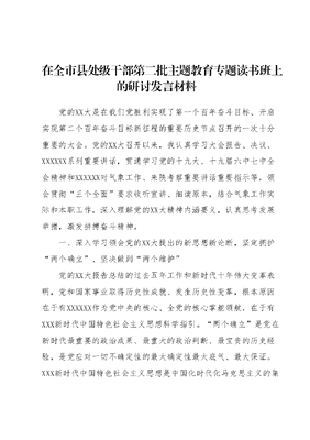 在全市县处级干部第二批主题教育专题读书班上的研讨发言材料党的XX大是在我们党胜利实现了第一个百年奋斗目标、开启实现第二个百年奋斗目标新征程的重要历史节点召开的一次十分重要的大会。党的XX大召开以来,我认真学习大会报告、决议、XXXXXX系列重要讲话,贯通学习党的十九大、十九届六中七中全会精神和XXXXXX对气象工作、来陕考察重要讲话重要指示等,领会贯彻三个全面要求收听宣讲、细读原本,结合气象工作实际和本职工作,深入理解党的XX大精神内涵要义,认真思考发展举措,激发拼搏奋斗精神。一、深入学习领会党的XX大提出的新思想新论断,坚定拥护两个确立、坚决做到两个维护党的XX大报告总结的过去五年工作和新时代十年伟大变革表明,党和国家事业取得历史性成就、发生历史性变革,根本原因在于有XXXXXX作为党中央的核心、全党的核心掌舵领航,在于有XXX新时代中国特色社会主义思想科学指引。两个确立是党在新时代最重要的政治成果、最重大的政治判断、最宝贵的历史经验,是党应对一切不确定性的最大确定性最大底气、最大保证。XXX新时代中国特色社会主义思想是中国化时代化马克思主义的集中体现,党的十九大、十九届六中全会提出的十个明确四个坚持、十三个方面成就是这一思想的主要内容。深入学习贯彻党的XX大精神,我们就要深刻领悟两个确立的决定性意义,把两个维护体现在对党的核心的敬仰爱戴上,落实在对党的创新理论的学习践行上,更加紧密地团结在以XXX同志为核心的党中央周围,更加自觉地学懂弄通做实XXX新时代中国特色社会主义思想,把握好其世界观和方法论,坚持好、运用好贯穿其中的立场观点方法,领会六个坚持蕴含的政治立场、重大原则科学方法,坚持不懈用XXX新时代中国特色社会主义思想凝心铸魂武装头脑、指导实践、推动工作,把党的创新理论转化为做好工作的强大实践动力。二、深刻领会以中国式现代化推进中华民族伟大复兴的使命任务,推进××气象事业高质量发展党的XX大明确了新时代新征程中国共产党的中心任务,阐述了中国式现代化的中国特色和本质特征,科学谋划了未来五年及更长时期党和国家事业发展的目标任务和重大部署,这是党团结带领全国各族人民全面建成社会主义现代化强国的集结号,也是实现第二个百年奋斗目标,以中国式现代化全面推进中华民族伟大复兴的冲锋号。明确提出,高质量发展是全面建设社会主义现代化国家的首要任务,要坚持以推动高质量发展为主题,建设现代化产业体系;要全面推进乡村振兴,全方位务实粮食安全根基以及促进区域协调发展、推进高水平对外开放的要求。明确提出要实现好、维护好、发展好最广大人民根本利益,健全基本公共服务体系,提高公共服务水平,增强均衡性和可及性,扎实推进共同富裕。要加快发展方式绿色转型,深人推进环境污染防治,保护生态系统,积极稳妥推进碳达峰碳中和。要增强维护国家安全能力,提高防灾减灾救灾和急难险重突发公共事件处置保障能力,这些都对气象工作提出了新要求深入学习贯彻党的XX大精神我们就要瞄准党壁画的宏伟蓝图,增强志气、骨气、底气,完整准确、全面贯彻新发展理念,认真落实XXXXXX对气象工作、对××工作的重要批示指示要求,全面推进落实《气象高质量发展纲要(2022-2035年)》和市政府《关于推进××气象高质量发展建设气象防灾减灾示范市实施方案》,努力构建科技领先、监测精密、预报精准、服务精细、人民满意的现代气象体系,加快气象服务数字化、智慧化转型和供给侧结构性改革,推进城乡公共气象服务均等化,优化人民美好生活气象服务供给,积极做好一山一水一平原生态系统保护修复、污染防治、气候变化应对等气象保障服务。坚持人民至上、生命至上,健全气象防灾减灾体制机制,提高气象灾害监测预报服务能力,切实发挥好防灾减灾第一道防线作用。心怀粮食安全能源安全、交通强国等国之大者,深化实施气象+赋能行动,全方位、多角度保障国民经济发展重点领域的高质量发展。落实党管干部、人才原则积极实施气象干部、人才培育行动,加快建设政治过硬、素质优良、适应新时代要求、具备领导和支撑现代化建设能力的××气象干部、人才队伍。深人贯彻落实新时代党的建设总要求,切实增强基层党组织的政治功能和组织功能,以高质量党建引领和保障高质量发展。三、深刻领会团结奋斗的时代要求,奋力为建设社会主义现代化国家作出新贡献XXXXXX说,新时代的伟大成就是党和人民一道拼出来、干出来、奋斗出来的!实现中华民族伟大复兴是中国共产党人的光荣梦想,全面建设社会主义现代化国家是一项伟大而艰巨的事业。党的XX大主题鲜明提出了团结奋斗的要求,总结回答了以党的自我革命引领社会革命的重大历史命题提出三个务必和五个必由之路的重要要求在新征程上,我们要牢记党员第一身份、为党工作第一职责、为民谋利第一目标,始终保持赶考的