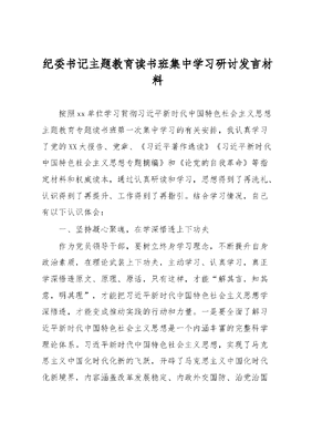 纪委书记主题教育读书班集中学习研讨发言材料按照xx单位学习贯彻习近平新时代中国特色社会主义思想主题教育专题读书班第一次集中学习的有关安排,我认真学习了党的XX大报告、党章、《习近平著作选读》《习近平新时代中国特色社会主义思想专题摘编》和《论党的自我革命》等指定材料和权威读本,通过认真研读和学习,思想得到了再洗礼、认识得到了再提升、工作得到了再指引。结合学习情况,自己有以下认识体会:一、坚持凝心聚魂,在学深悟透上下功夫作为党员领导干部,要树立终身学习理念,不断提升自身政治素质,在理论武装上下功夫,主动学习、认真学习,真正学深悟透原文、原理、原话,只有这样,才能解其言,知其意,明其理,才能把习近平新时代中国特色社会主义思想学深悟透,才能变成推动实践的行动和力量。一是要全面了解习近平新时代中国特色社会主义思想是一个内涵丰富的完整科学理论体系。习近平新时代中国特色社会主义思想,实现了马克思主义中国化时代化新的飞跃,开辟了马克思主义中国化时代化新境界,内容涵盖改革发展稳定、内政外交国防、治党治国治军等方方面面,构成一个完整的科学体系。党的十九大、十九届六中全会提出的十个明确、十四个坚持、十三个方面成就概括了习近平新时代中国特色社会主义思想的主要内容。党的XX大提出了继续推进理论创新的科学方法六个必须坚持,是习近平新时代中国特色社会主义思想的立场观点方法的重要体现。我们要不断深化对习近平新时代中国特色社会主义思想的学习理解,全面深刻把握,不断增进政治认同、思想认同、理论认同、情感认同,自觉用习近平新时代中国特色社会主义思想指导各项工作。二是要深刻领会习近平新时代中国特色社会主义思想的理论重大意义。习近平新时代中国特色社会主义思想是党的十八大以来,以习近平同志为核心的党中央,根据国内外形势的变化和我国各项事业发展的新情况,以及我们面临的新任务和新挑战,坚持解放思想、与时俱进、求真务实,紧密结合新的时代条件和实践要求,以全新的视野进行艰辛的理论探索而取得的重大理论创新成果。回顾过去十年,我们经历了对党和人民事业具有重大现实意义和深远历史意义的三件大事:一是迎来中国共产党成立一百周年,二是中国特色社会主义进入新时代,三是完成脱贫攻坚、全面建成小康社会的历史任务,实现第一个百年奋斗目标。新时代十年的伟大变革,在党史、新中国史、改革开放史、社会主义发展史、中华民族发展史上具有里程碑意义。这种伟大的成就与变革,为我们继续前进奠定了坚实基础、为我们企业发展创造了良好条件、为我们的工作提供了重要保障。三是要从习近平新时代中国特色社会主义思想中汲取奋进新征程的智慧力量。持续深化接受革命性锻造的认识,自觉在精神上接受洗礼,锚定凝心铸魂筑牢根本、锤炼品格强化忠诚、实干担当促进发展、廉洁奉公树立新风的目标,进一步夯实思想基础,主动在深学细悟中经受思想淬炼、精神洗礼,不断增强政治判断力、政治领悟力、政治执行力,做到始终以党的旗帜为旗帜、以党的意志为意志、以党的使命为使命,心往一处想、劲往一处使,立足职责使命,聚焦企业面临的形势任务、风险挑战和自身存在的短板不足,坚持多思多想、深学细悟,不断提高运用党的创新理论分析问题、解决问题的能力,善于结合分管和服务领域工作实际从党的创新理论中找方向、找思路、找举措、找办法,以实招、硬招、新招推动高质量发展行稳致远。二、坚持自我革命,在真抓实干上下功夫始终秉持勤奋务实、埋头苦干良好品格,从新思想中坚定前进的信心力量,牢牢把握四个自我科学内涵,淬炼自我革命锐利思想武器,坚守自我革命根本政治方向。一是要持续增强自我革命的政治定力。党的十八大以来,以习近平同志为核心的党中央开展了史无前例的反腐败斗争,以得罪千百人、不负十四亿的使命担当祛疴治乱,以坚定的决心、顽强的意志推进全面从严治党,取得了历史性、开创性成就,找到了自我革命这一跳出治乱兴衰历史周期率的第二个答案。在新时代新征程上,要不断增强政治免疫力,牢牢坚持党的绝对领导,坚持党的自我革命的创新成果,牢固树立以党的自我革命引领社会革命的政治自觉和实践自觉,坚定拥护两个确立、坚决做到两个维护,在感情上拥戴核心,在思想上紧跟核心,在政治上忠诚核心,在行动上捍卫核心。二是要持续增强自我革命的行动力。要切实增强自我革命的思想自觉和行动自觉,始终清醒认识反腐败斗争依然严峻复杂的形势任务,积极践行一线工作法,进一步锤炼严实的作风,认真用好深学习、实调研、抓落实的工作方法,带头深入调查研究,带着问题到基层,摸清重难点、紧盯关键点、找准落脚点,着力发现问题、解决问题,干实事、谋实招、求实效。始终坚定把党的伟大自我革命进行到底的决心,时刻做到带头勇于自我革命,把自己摆进去,把工作摆进去,树牢底线思维,把初心和使命变成锐意进取、开拓创新的精气神和埋头苦干、真抓实干的原