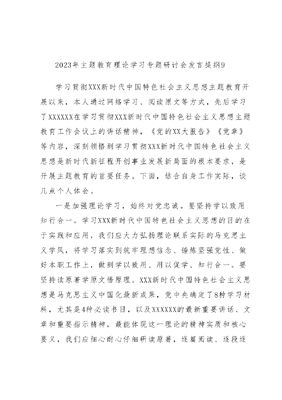 2023年主题教育理论学习专题研讨会发言提纲9学习贯彻XXX新时代中国特色社会主义思想主题教育开展以来,本人通过网络学习、阅读原文等方式,先后学习了XXXXXX在学习贯彻XXX新时代中国特色社会主义思想主题教育工作会议上的讲话精神,《党的XX大报告》《党章》等内容,深刻领悟到学习贯彻XXX新时代中国特色社会主义思想是新时代新征程开创事业发展新局面的根本要求,是开展主题教育的首要任务。下面,结合自身工作实际,谈几点个人体会。一是加强理论学习,始终对党忠诚。要坚持学以致用知行合一。学习XXX新时代中国特色社会主义思想的目的在于实践和应用,我们应大力弘扬理论联系实际的马克思主义学风,将学习落实到筑牢理想信念、锤炼坚强党性、做好本职工作上,做到学以致用、用以促学、知行合一。要坚持读原著学原文悟原理。XXX新时代中国特色社会主义思想是马克思主义中国化最新成果,党中央确定了8种学习材料,尤其是4种必读书目,以及XXXXXX的最新重要讲话、文章和重要指示精神,最能体现这一理论的精神实质和核心要义,我们应细心耐心仔细研读原著,逐篇阅读、逐段逐句领悟,确保常学常新、真学真信。要坚持领导干部领学带学促学。此次主题教育以县处级以上领导干部为重点,旨在让关键少数发挥示范作用,引领全社会的学习,让党的创新理论普及化。我应充分发挥关键少数的示范带动作用,以上率下领学、带学、促学,讲好专题党课做好学习分享,注重方式、改进方法,力求喜闻乐见、深入人心。二是坚持以民为本,始终亲民爱民。在思想认识上,坚持牢记初心、执政为民。全心全意为人民服务是中国共产党的立党之本、执政之基,XXXXXX也在不同场合的重要讲话和重要指示中多次强调始终把人民放在心中的最高位置,这是对各级领导干部的殷切希望和明确要求。作为党员领导干部,要认真学习领会XXXXXX关于民生工作的重要论述,增强为人民谋幸福的责任感和使命感,着力解决群众最关心最现实的问题,不断增强人民群众的获得感幸福感、安全感;要深入学习XXXXXX一以贯之的人民情怀时刻不忘中国共产党来自人民、根植人民、服务人民,始终把人民对美好生活的向往作为奋斗目标,切实实现好、维护好、发展好最广大人民的根本利益,以不断巩固发展反腐败斗争压倒性胜利,赢得人民群众的信任和拥护;要大力弘扬四下基层四个万家马上就办、真抓实干优良作风,深入学习践行廖俊波精神,密切联系群众深入基层一线,倾听群众呼声,回应群众关切,让群众切身感受到党员干部就在身边;要把全会确定的蓝图变为现实,特别是群众最关心的教育、医疗、养老、收入、环境等问题,跟进监督、精准监督、做实监督,真刀真枪推动解决群众急难愁盼问题,让群众获得感成色更足、幸福感更可持续、安全感更有保障。三是坚持廉洁从政,始终严于律己。XXXXXX指出:廉洁奉公,就是保持共产党人艰苦朴素、公而忘私的光荣传统,从不以功臣自居,不计较个人得失,不贪图享受,守纪律、讲规矩,生动体现了共产党人应有的道德风范。共产党人拥有人格力量,才能赢得民心。全党同志都要明大德、守公德、严私德,清清白白做人、干干净净做事,做到克己奉公、以俭修身,永葆清正廉洁的政治本色。我们要着力增强自我革命的思想自觉和行动自觉,充分认识开展主题教育的重大意义大力发扬自我革命精神,坚持不懈把全面从严管党治党向纵深发展。要完善管理机制,不断深化细化四责协同机制,建立明确责任清单、明晰责任界限、清晰责任落实可依责任追究的责任体系;要规范行为,全面构建权责清晰、流程规范、预警及时、监控有力的廉政风险防控体系要注重源头治理,坚持严管与厚爱相结合,激励与约束并重,严格执行中央八项规定精神及省市县实施办法、十条禁令等铁规禁令。